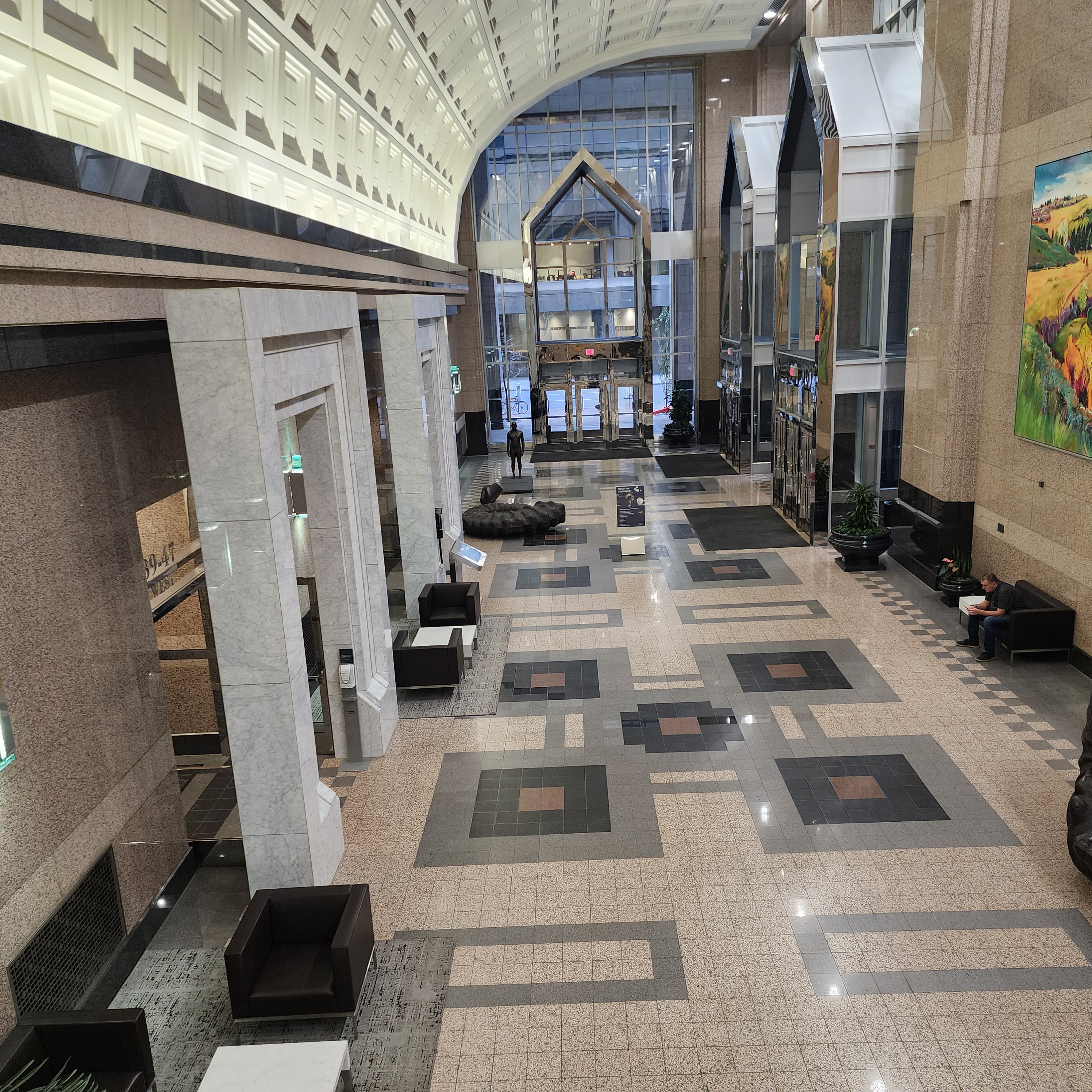 Go to the bank, get funds, stroll through the towers to the West of Banker's Hall, the wide atriums with "modern" furniture, the comfortable cafe's and boutiques that pander to the tenants, much quieter than Banker's Hall, more serious. Beautiful spaces, like churches made into mazes, with widely spaced tables over multiple levels where Men in Suits talk quietly, in hushed tones, of Trust Funds, of Hedge Funds, of Variable Fixed Rate Mortgages, Interest Rates...