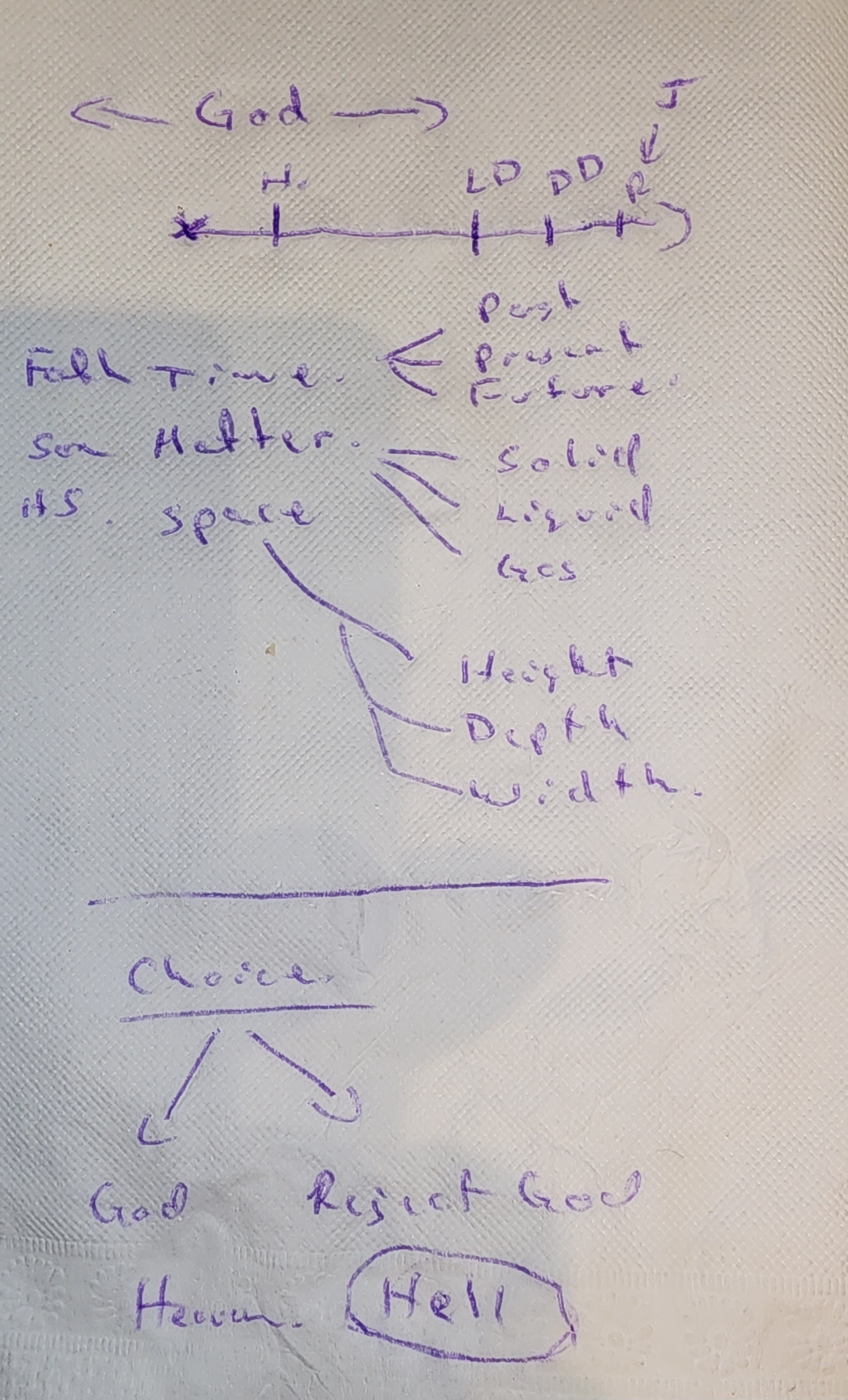 Friday night is slow, a regular, in by himself, the last table leaves at 7:00, he's oblivious, hangs out until 9:00, "lost track of the time". He'd been in for lunch, with a fellow church member, a long conversation and a napkin left behind gave me some inkling as to his beliefs.