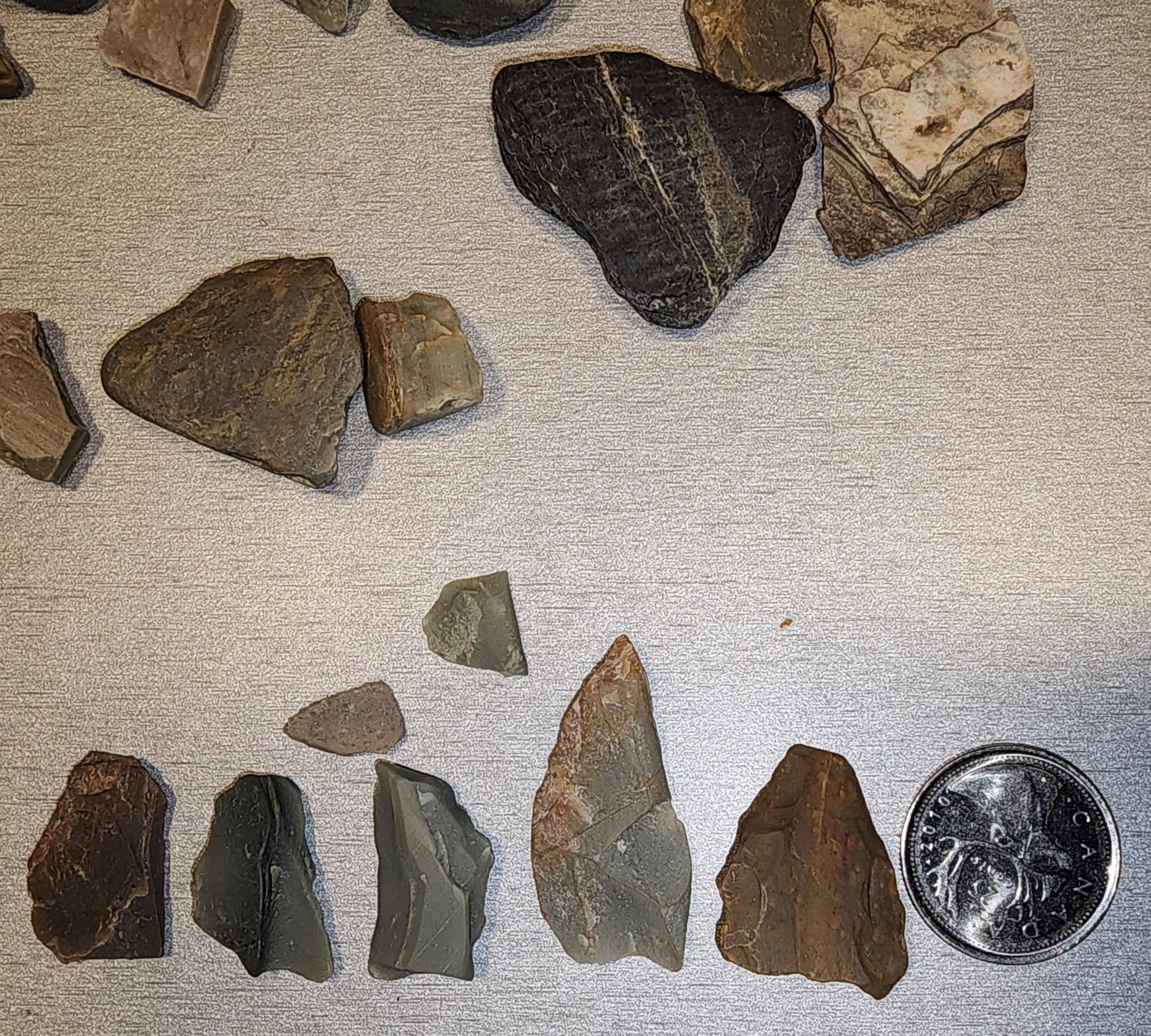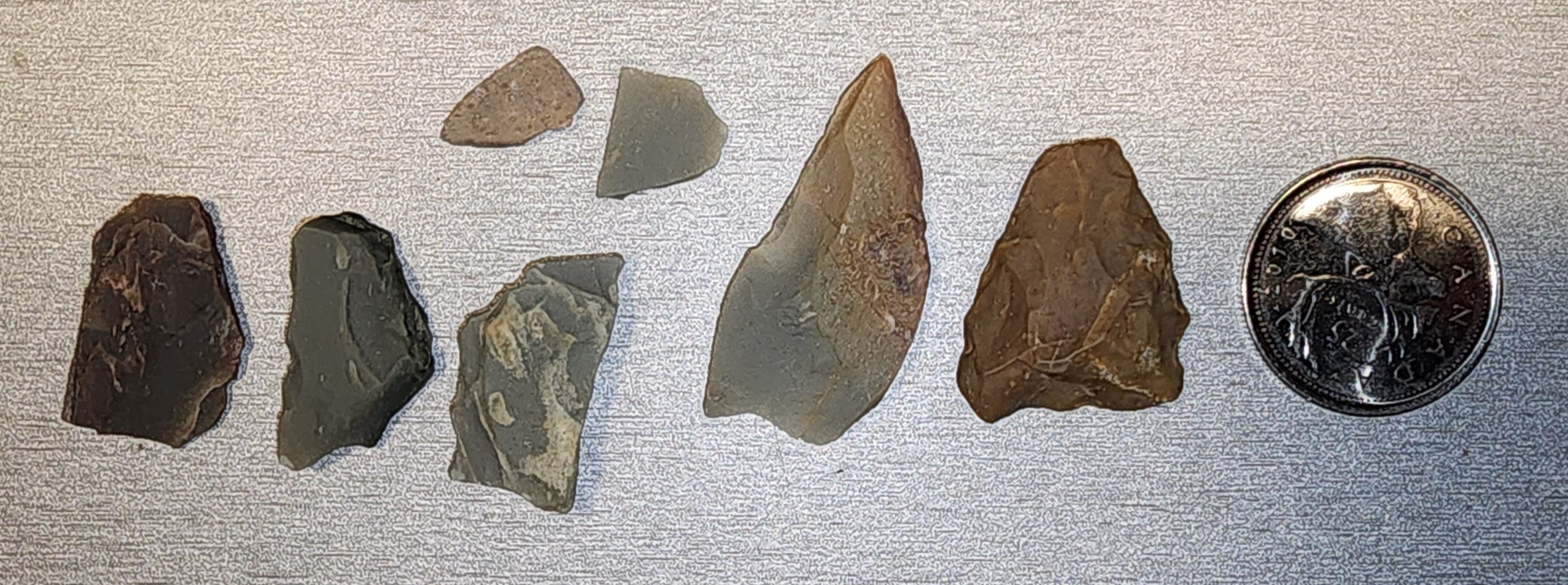 (worked bits of flint, scrapers, arrowhead far right next to quarter)
