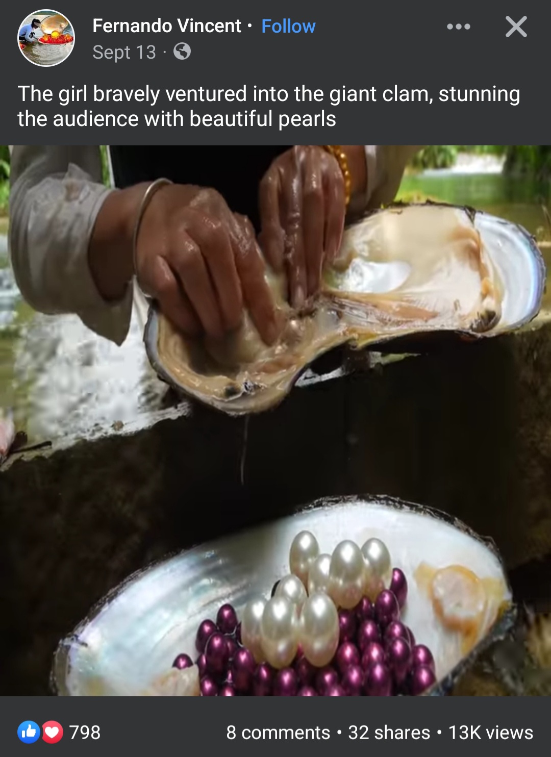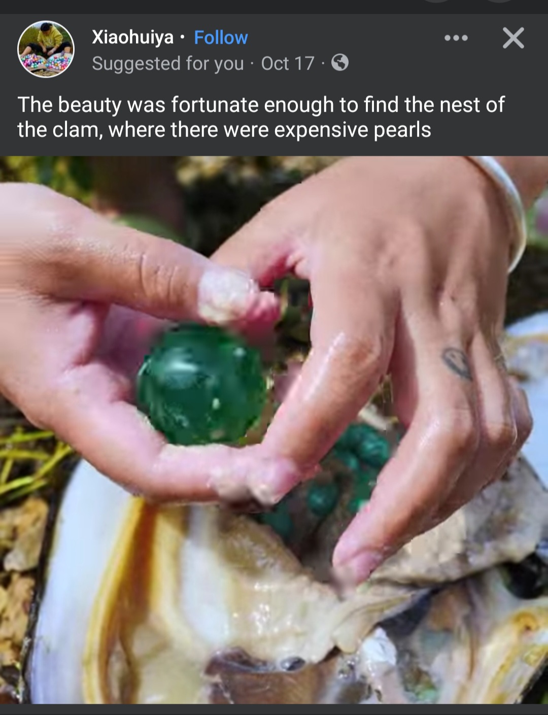 This girl is great, Asian, I'm guessing somewhere in China, she wades into the stream, looking for clams, when she finds one opening it to find no end to preposterous treasures. The happy face tattooed on her middle finger suggests some cultural alliances...