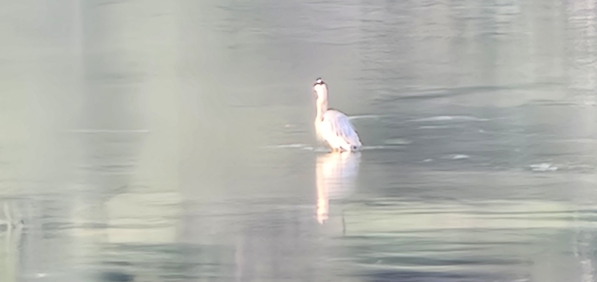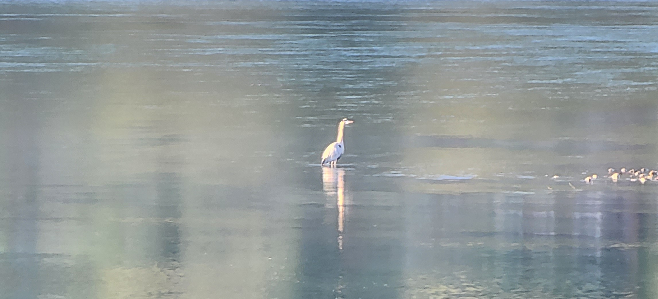 Mornings, wake up overlooking Queens Bay, a couple of Canada Geese have set up their nest on a pier, a great blue heron to the right casts a great reflection before flying away. I'll see him (??) every morning.