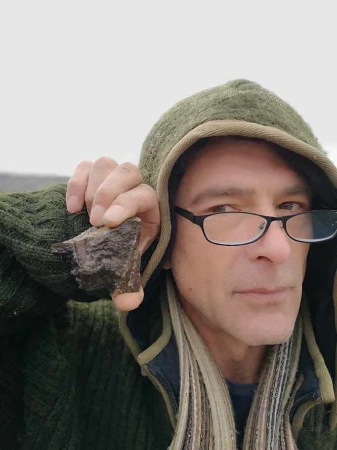 A cool day, but better than weeks to come, we try a couple of new areas and find a new bonebed. The weather; cool, rainy, generally shit, and there's no climbing, the bentonite is far too slippery. But very shortly into the new bonebed I find this: