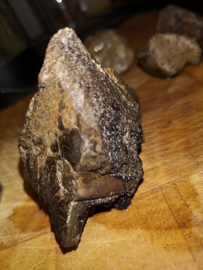 More clearly visible - the tooth at bottom indenting into the bone, just guessing but maybe Spinosaurus? The tooth measures approximately an inch, although I'd need to get a dental pick and clean it to be certain. What is cool - that something attempted to eat something else and left a bit of itself behind...
