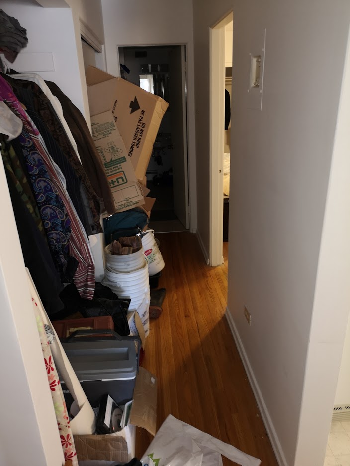 This is the hallway. And this - this is a thoroughfare, it's the cleanest aisle in the whole goddamned apartment. The living room is unlivable, the kitchen is already overflowing with projects, the bedroom, overflow for the living room, the bathroom is the only room that's even remotely serviceable. So I spent the day in the bedroom - and by the end it's one room clear. But man oh man do I got to get rid of some stuff...Slowly, slowly...