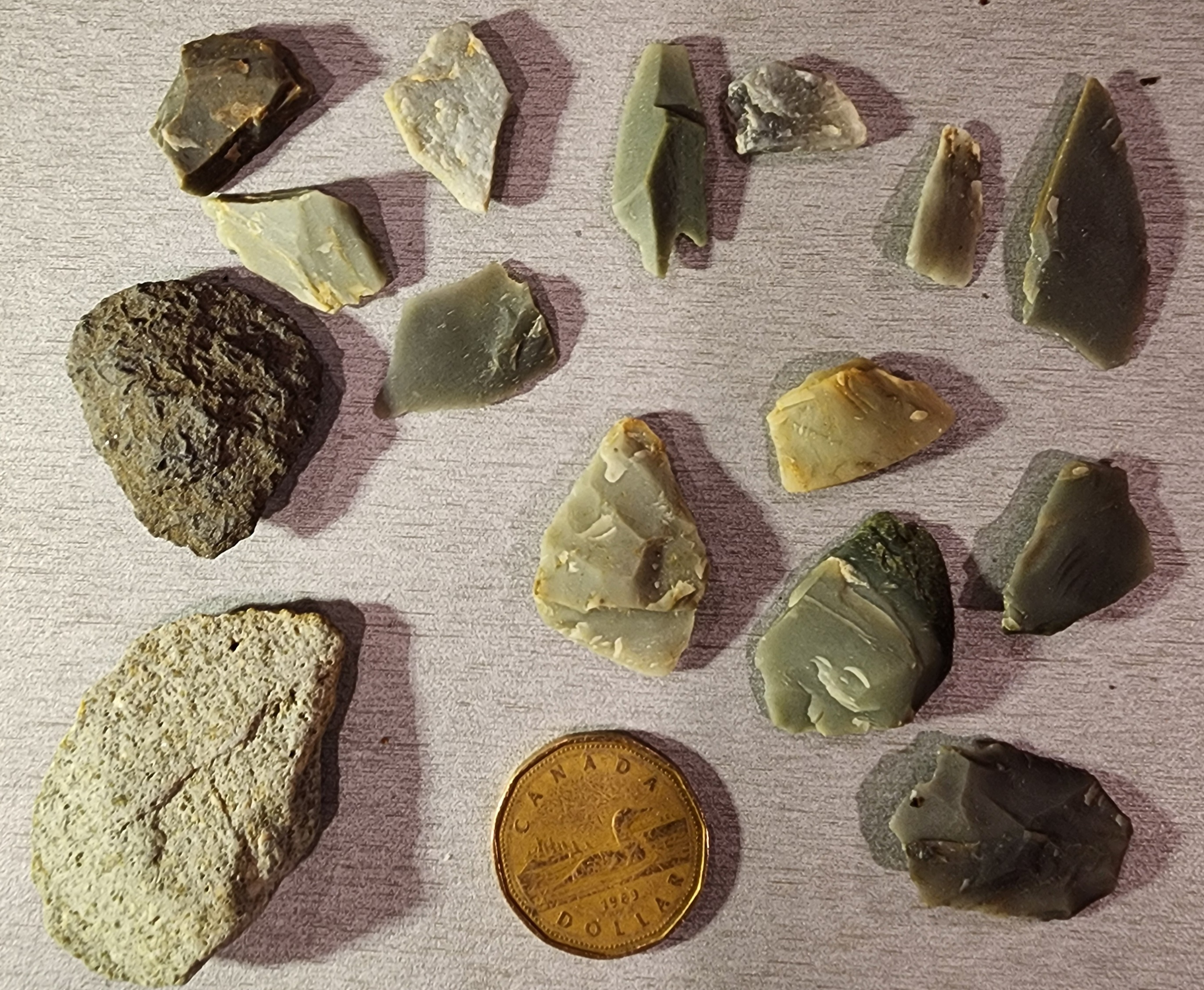 From loonie, left - a scraper, (I think, oddly shaved to a sharp edge from both sides, bilateral), above left, oddly shaped rock out of some sort of tourmalinated schist, oddly shaped and out of place on a washout. Above loonie, arrowhead, hard to see but to handle it becomes obvious, knapped both sides to a symmetrical point, otherwise mostly debitage, a couple of "micro-blades" (or debitage, again), and to the right, a carefully worked flint, dark grey, knapped both sides, almost as if it were an arrowhead that lost it's head, then got repurposed.