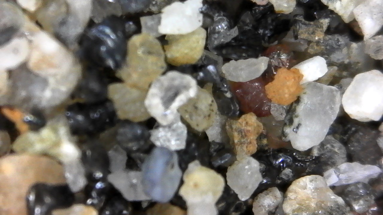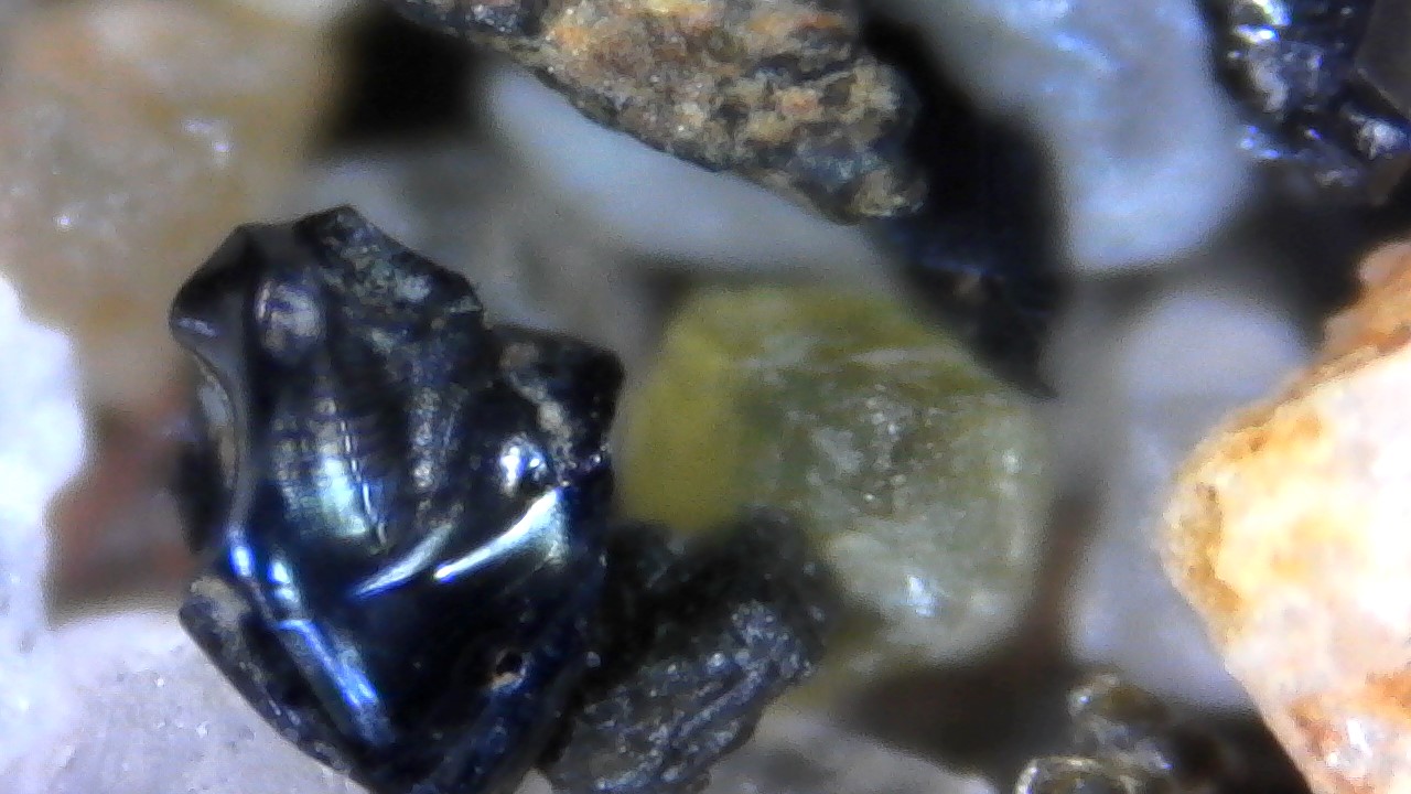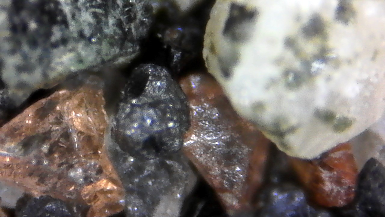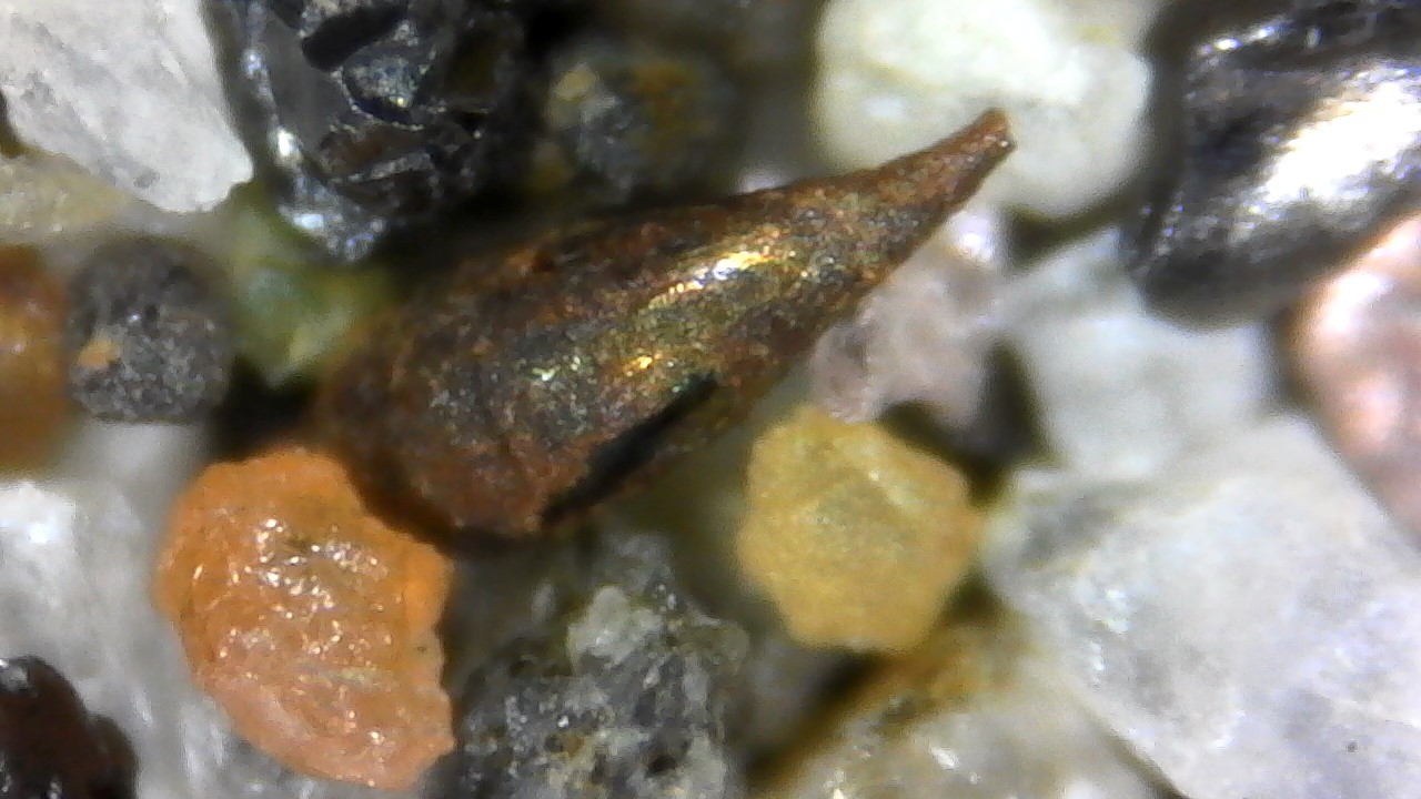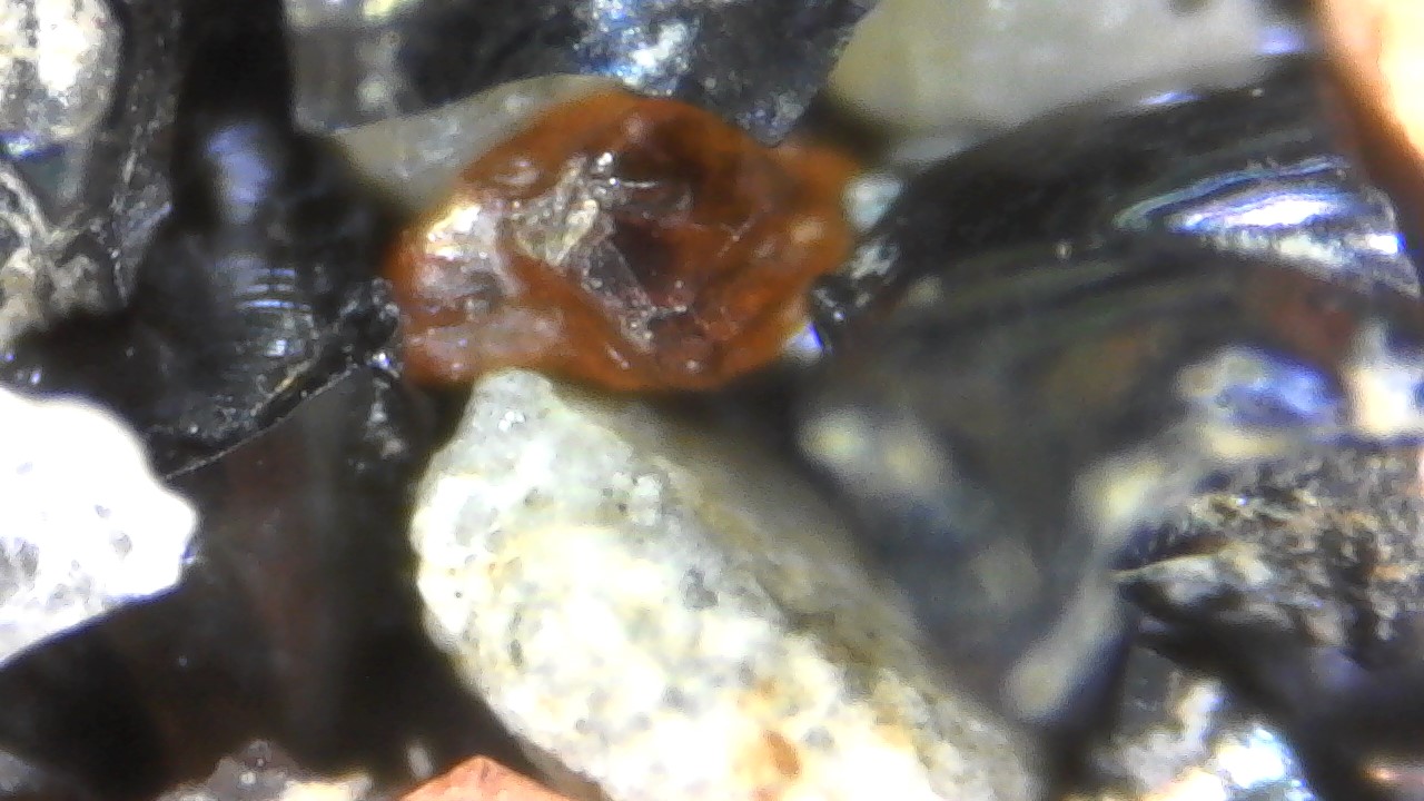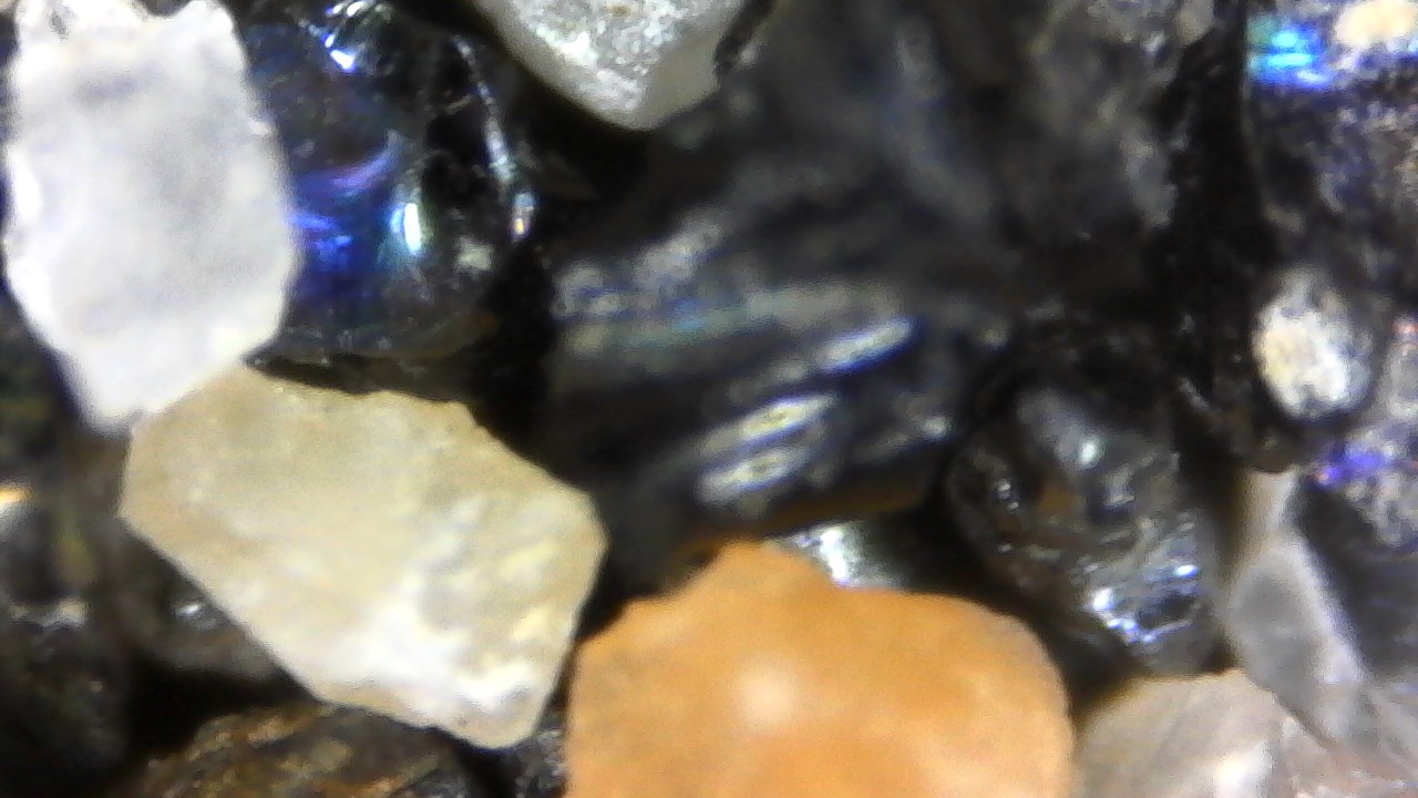 Pictured - under the USB microscope - abundant quartz, garnet, some what appears to be spessartine garnet (orange), hematite spheres (lots of those), various amphiboles, peridot, etc, etc.
