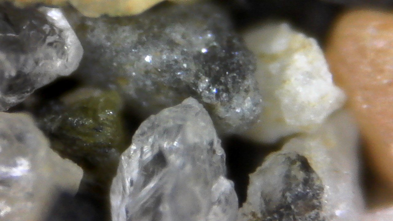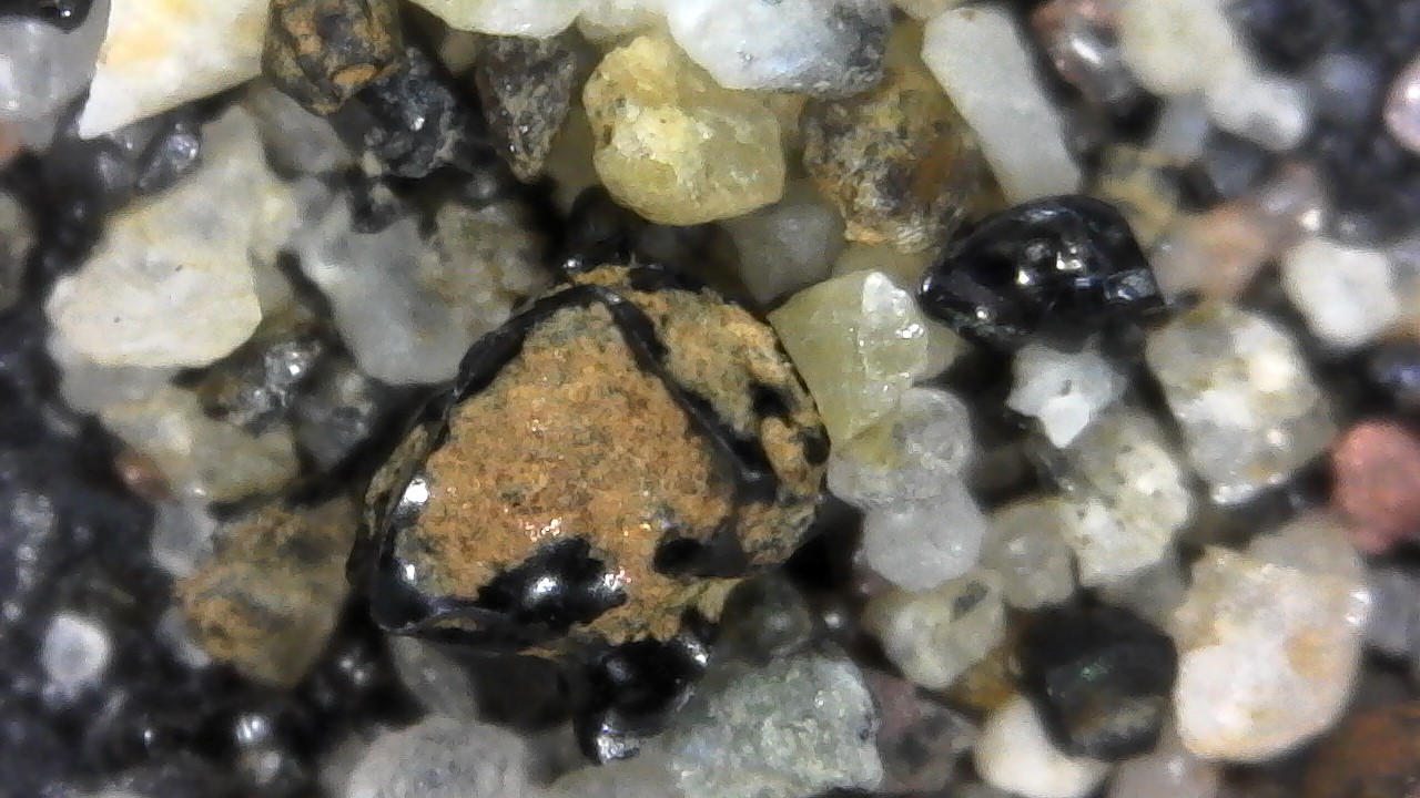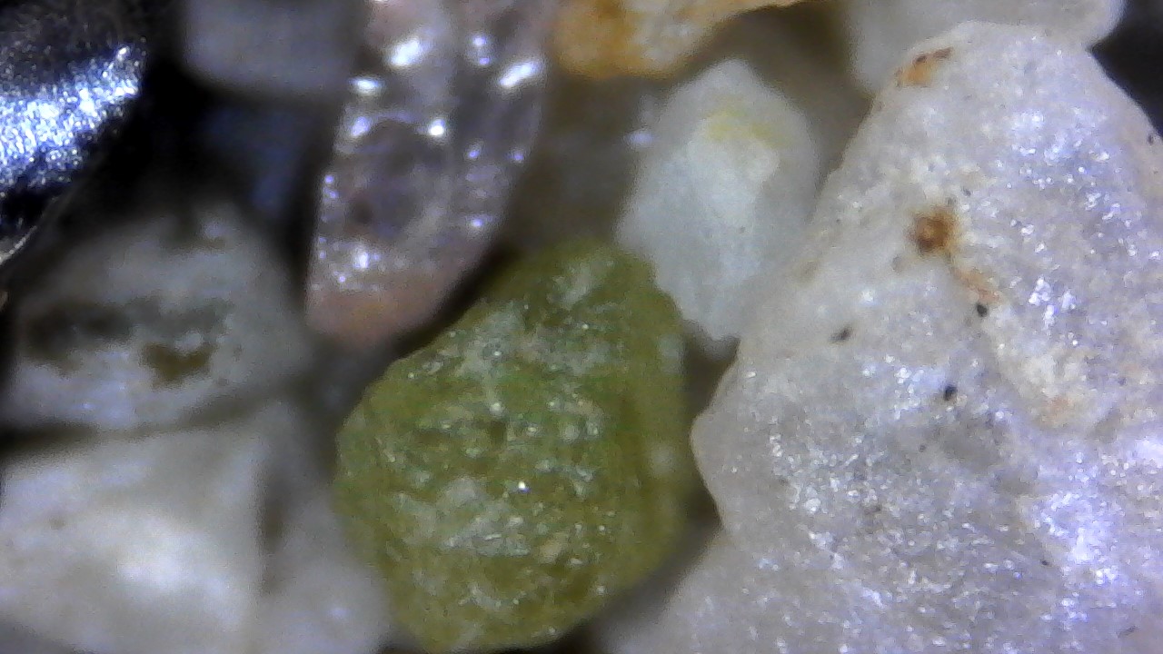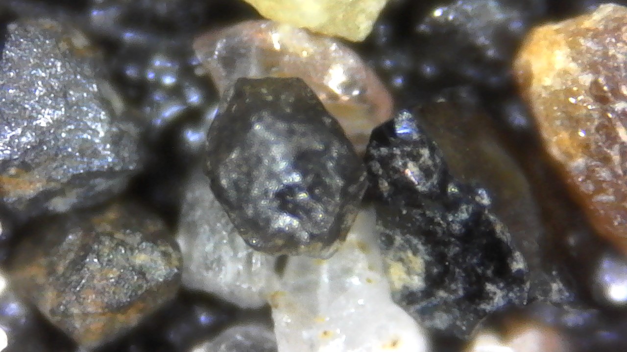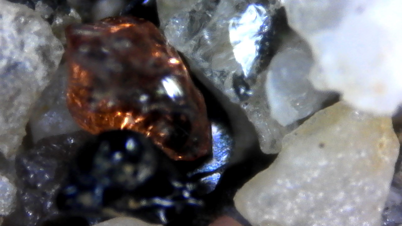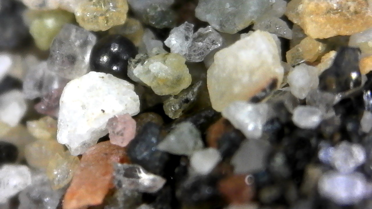 Pictured - under the USB microscope - abundant quartz, garnet, some what appears to be spessartine garnet (orange), hematite spheres (lots of those), various amphiboles, peridot, etc, etc.