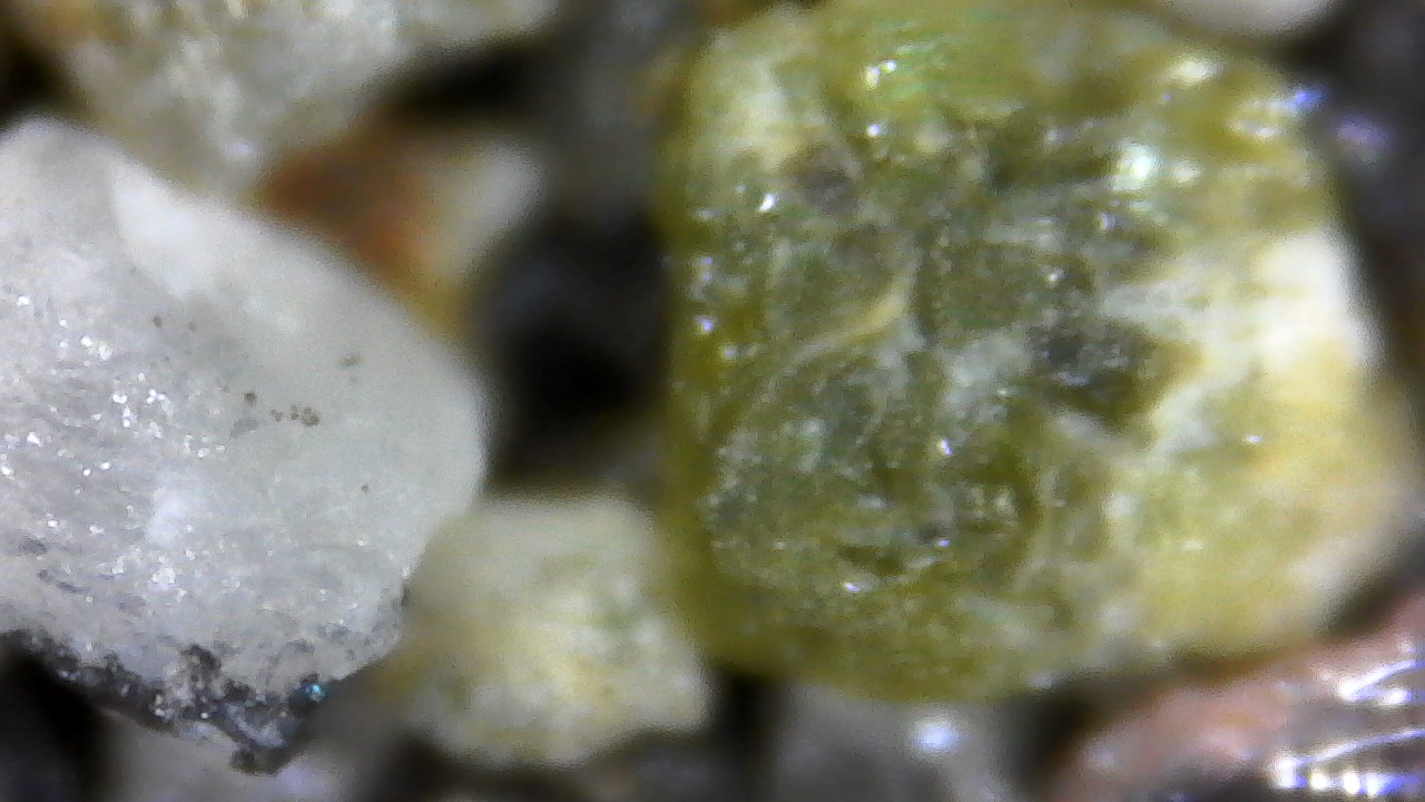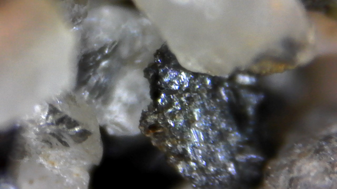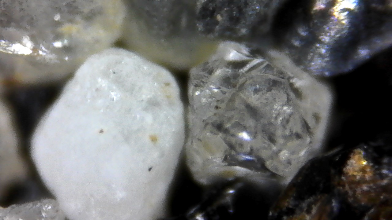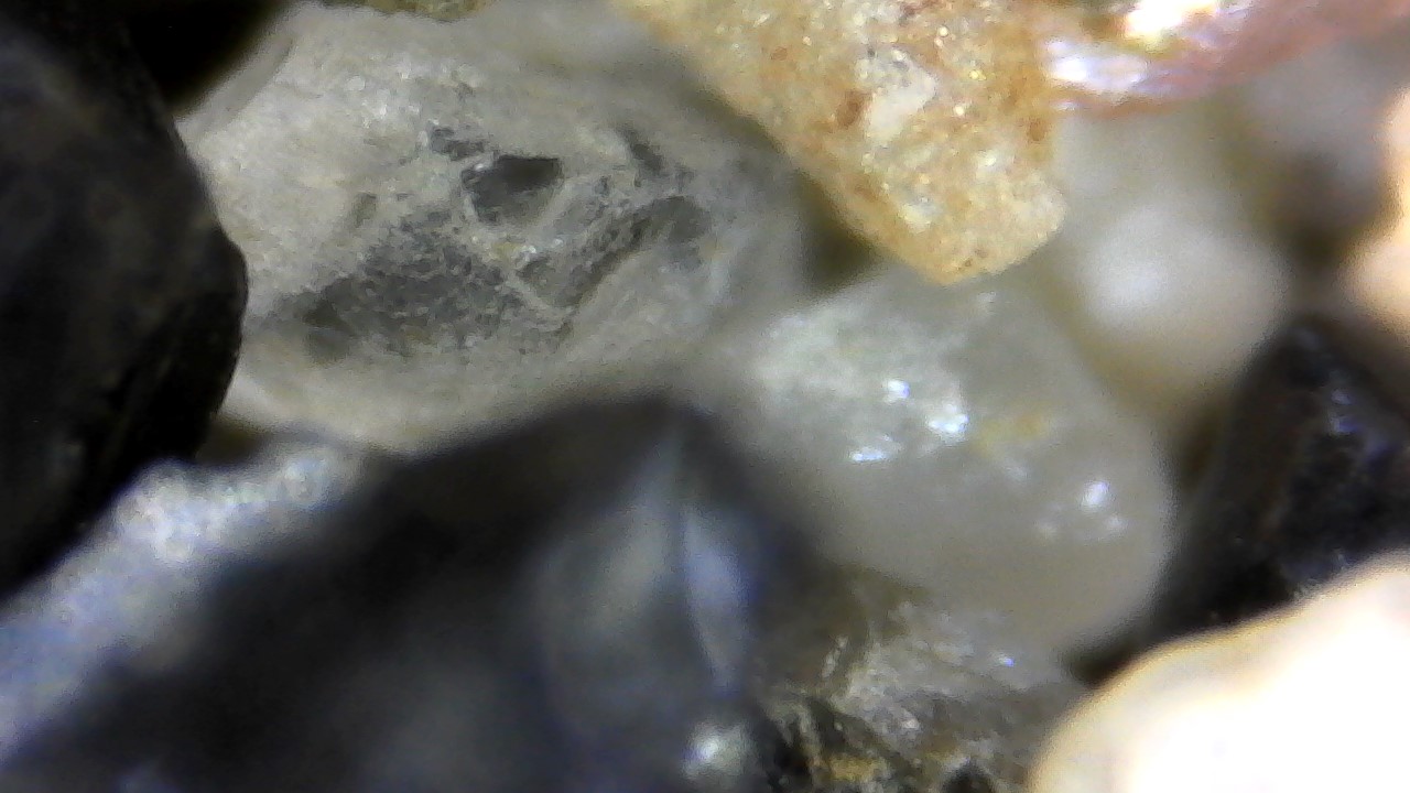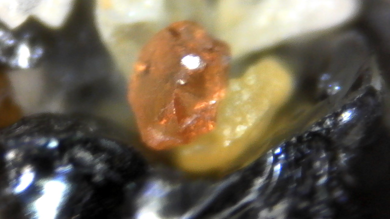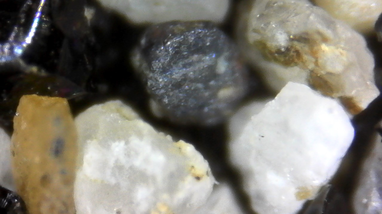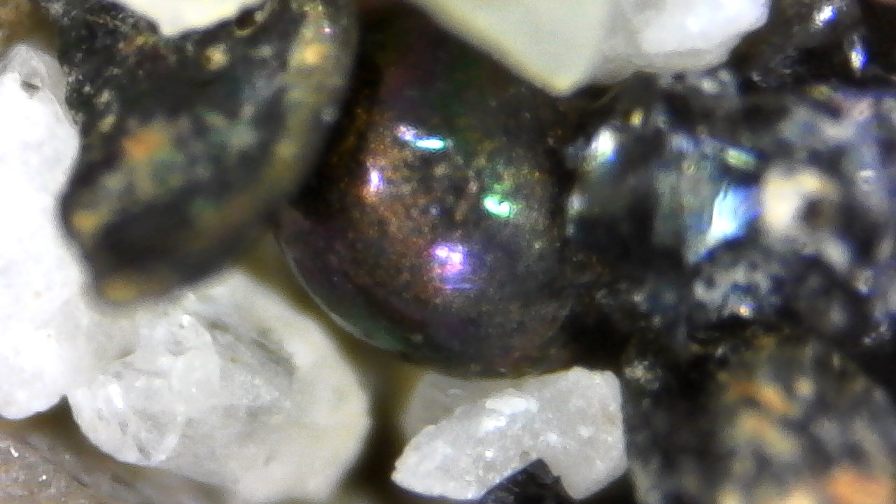 Pictured - under the USB microscope - abundant quartz, garnet, some what appears to be spessartine garnet (orange), hematite spheres (lots of those), various amphiboles, peridot, etc, etc.