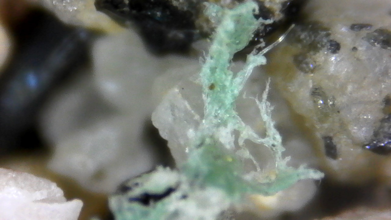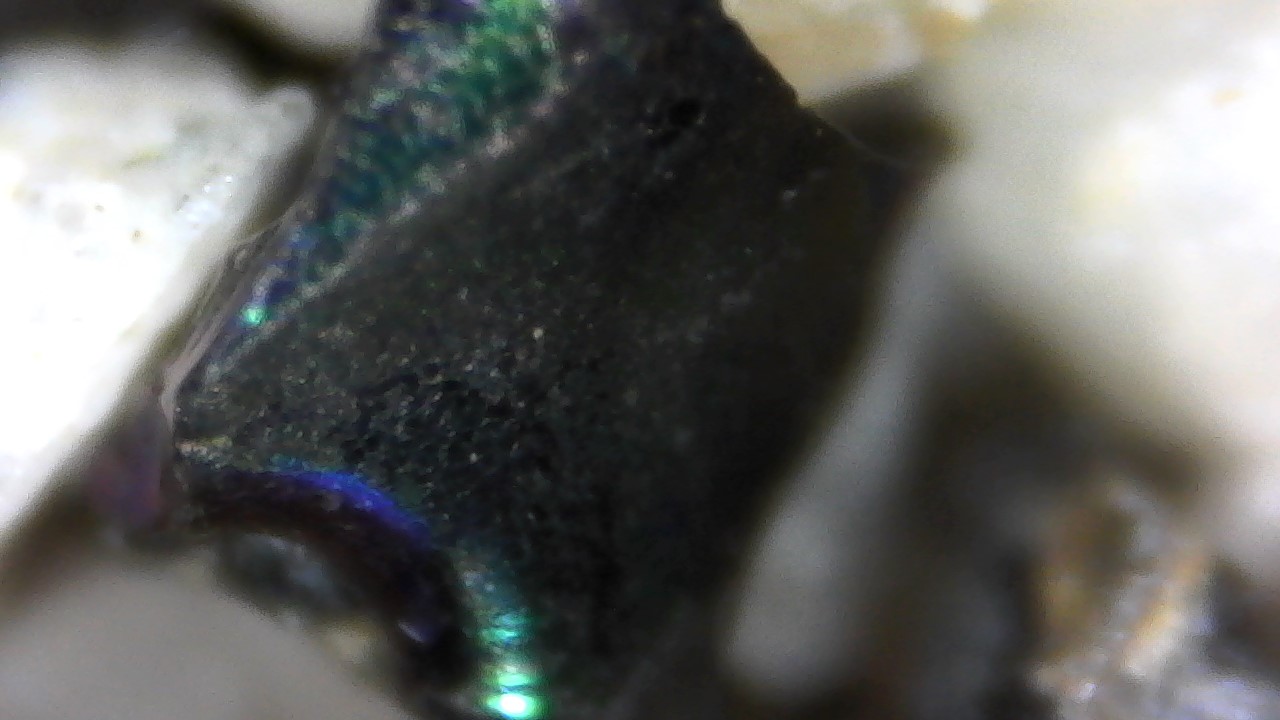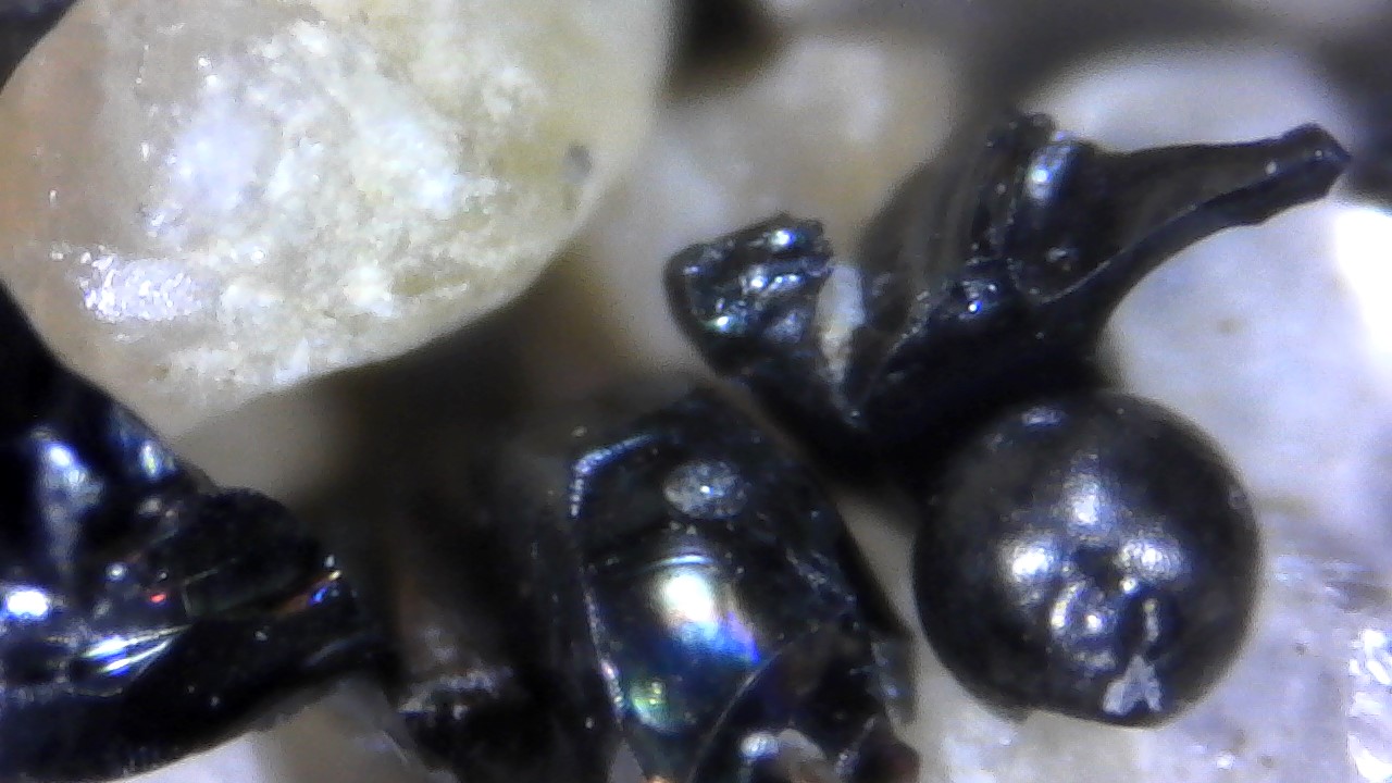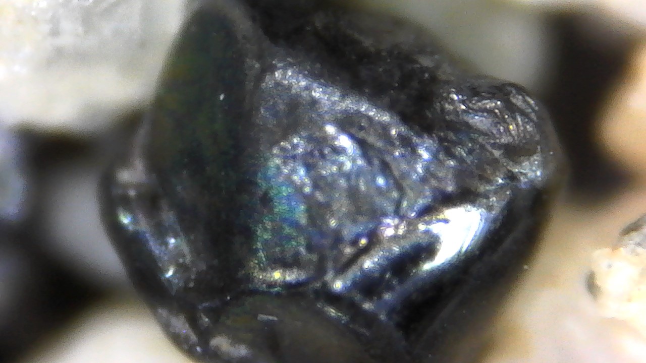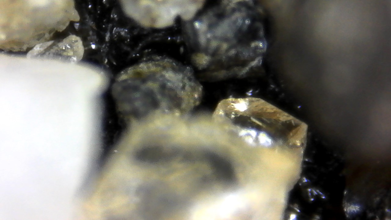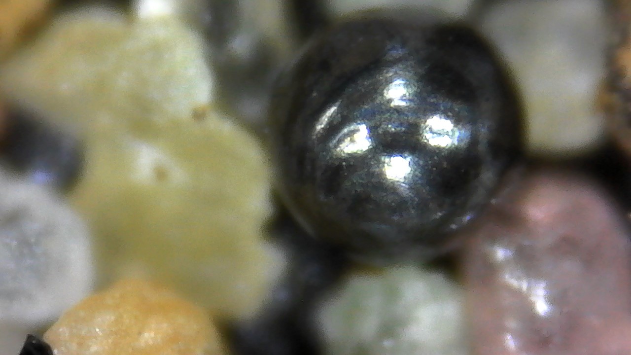 Pictured - under the USB microscope - abundant quartz, garnet, some what appears to be spessartine garnet (orange), hematite spheres (lots of those), various amphiboles, peridot, etc, etc.