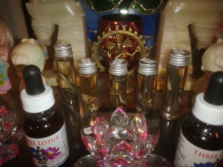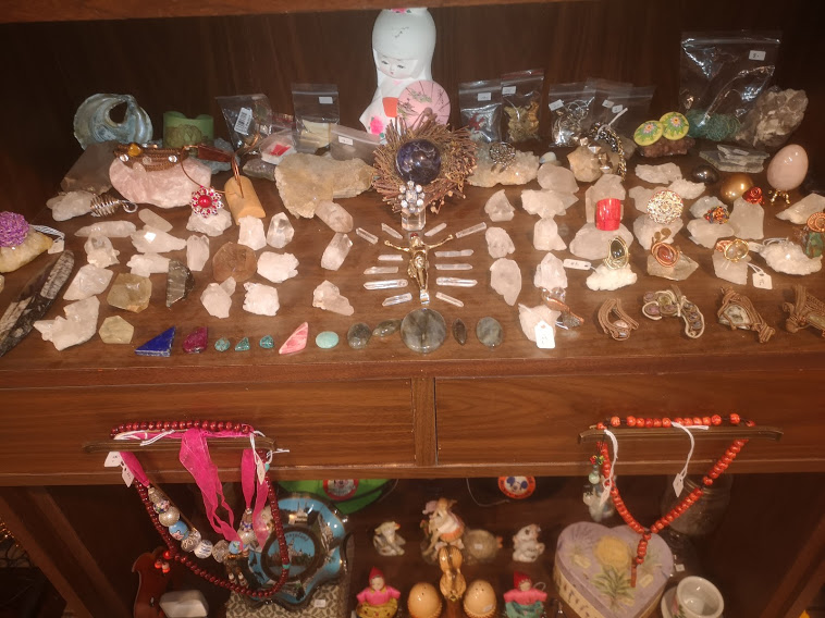 An assortment of crystals, wrappings, figurines. No single thing grabs me, but the display works...