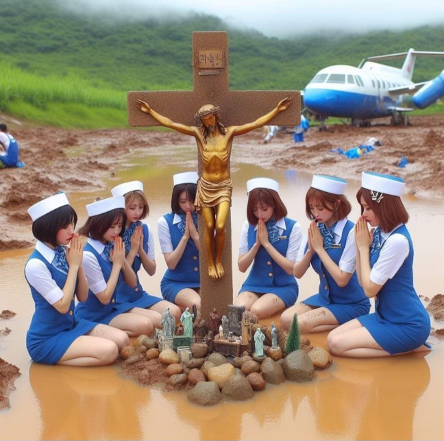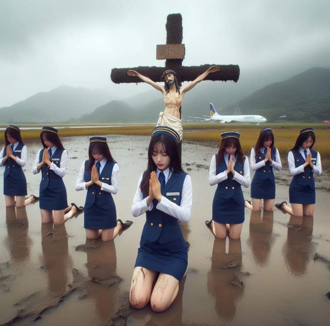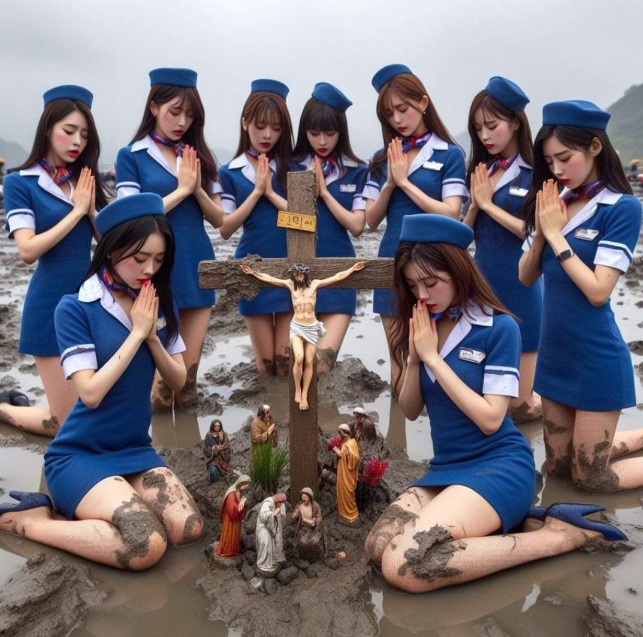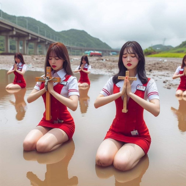 These are too common - a throng of (guessing Korean) flight attendants getting filthy in the mud, worshiping JC.