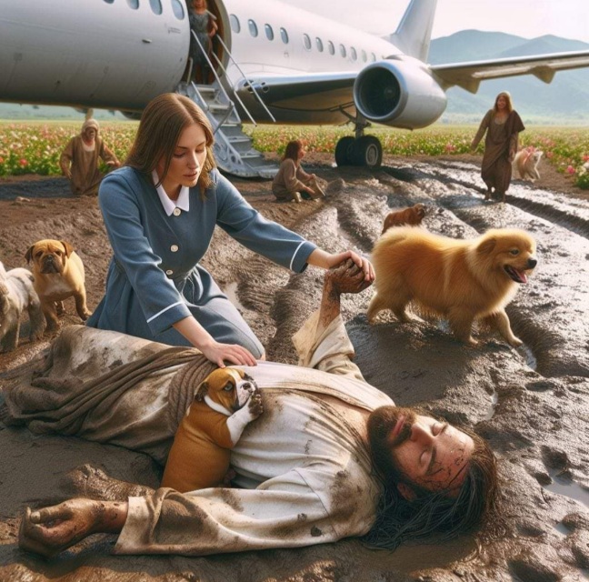 Ooops, looks like Jesus still died. The puppies don't seem as sad as they should. And, given the remarkably good landing of a 7-47 in a rice paddy, how did JC die? I'll bet she killed him....looks like the 6 fingered death-punch...