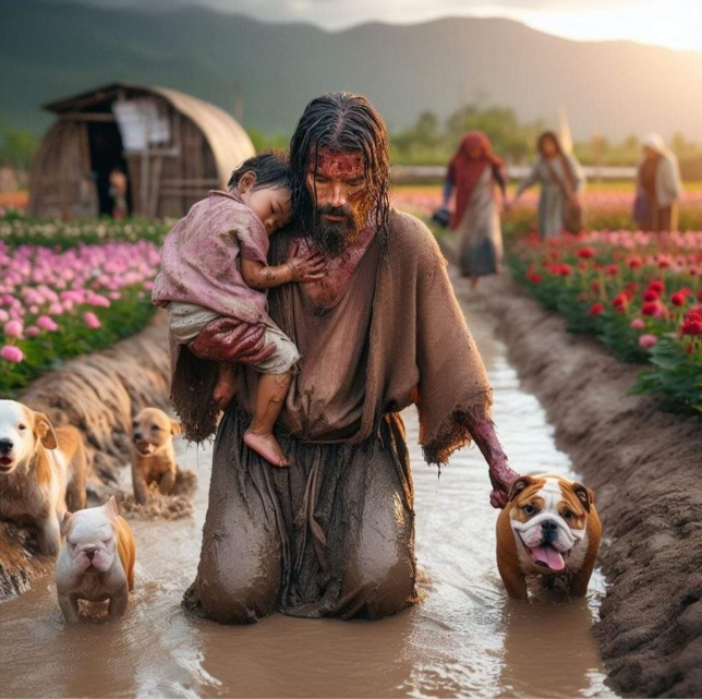 Another one. Jesus carrying a little Asian Child from the Tulip Paddies of Amsterdam. With his dogs.