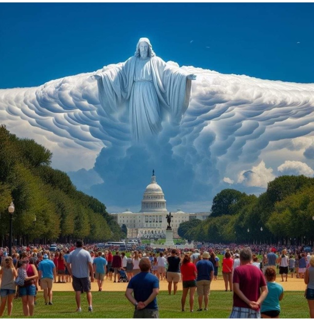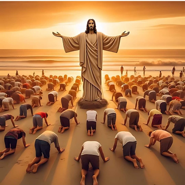 A very large crowd of people ignoring Jesus to worship the setting/rising? sun...