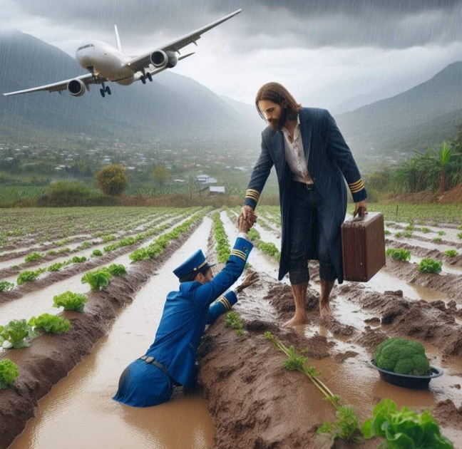 Here another one - Pilot Jesus saving a presumably fallen pilot - welcoming him to heaven with that little bowl of broccoli.