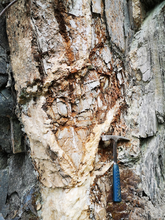 Promising vein of rotting, rusty quartz. West of Trout Lake, beside the road, I should have gathered some of the degraded rust and panned it, but as it was beside the road I told myself that it had doubtless been done before. That's piss-poor reasoning.