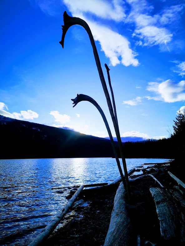 Staffs in the sand, resembling dragons, campsite.