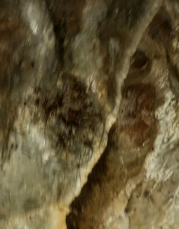 Another mine, a few yards deeper - further up the road. Again, invisible from the highway at driving speed. This one has in the back formed some beautiful calcite terraces and "cave pearls". All this in probably a hundred short years..