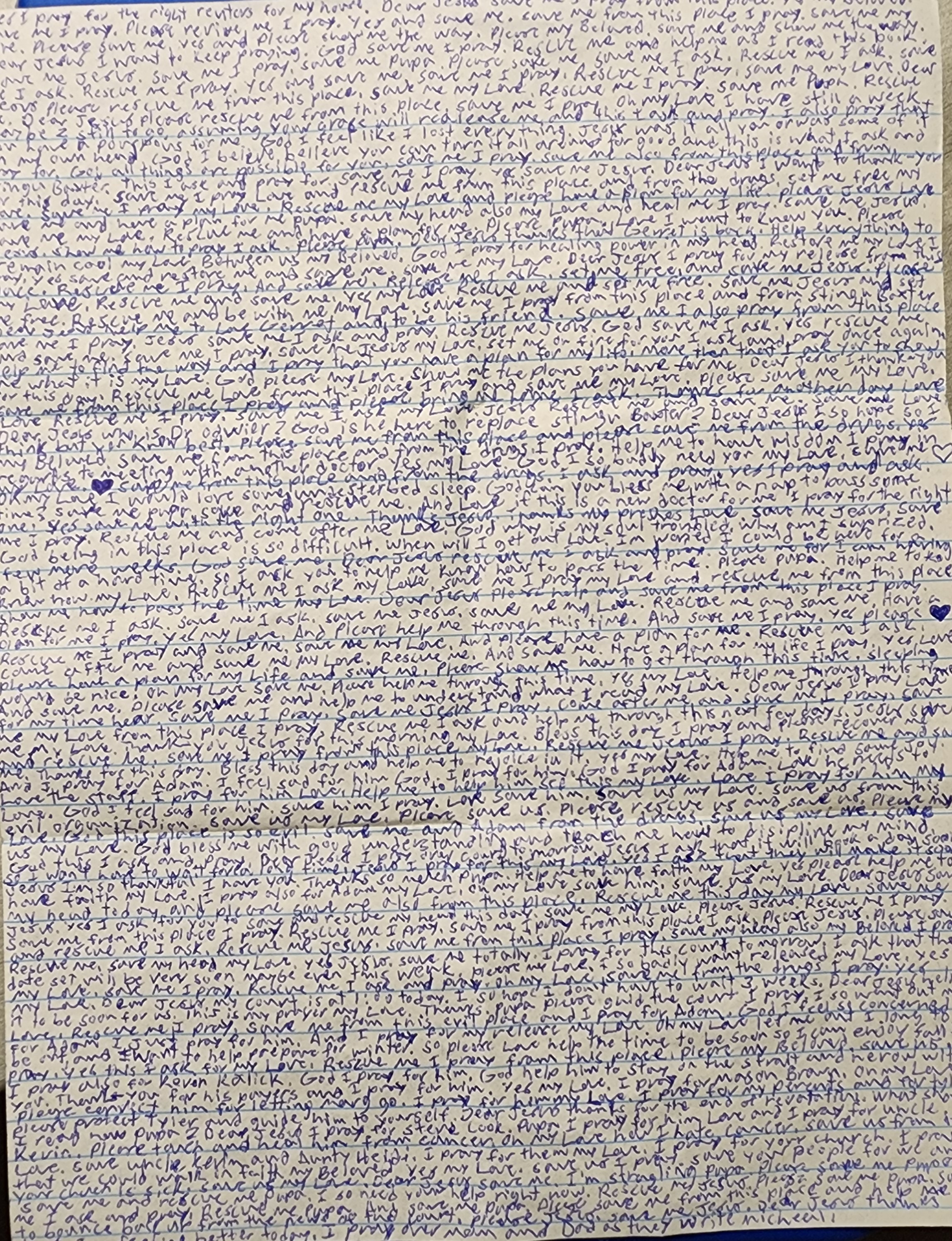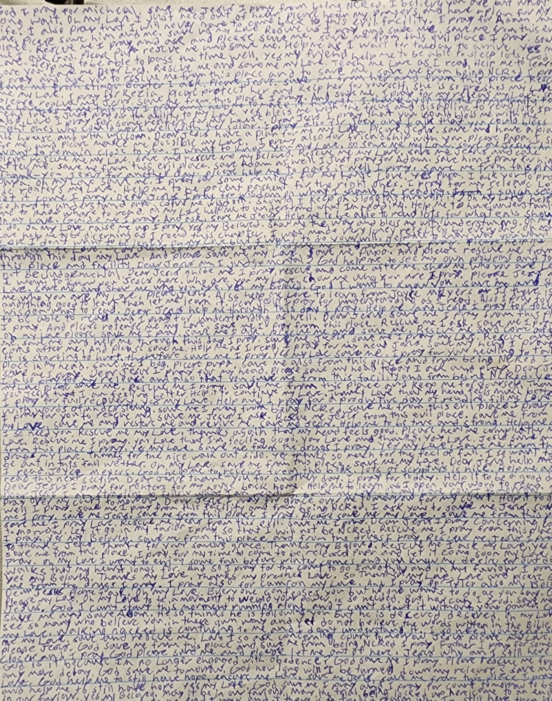 That's 2 sides of an 8X11 ruled paper. 3 handwritten lines per line, prayers and entreaties to Jesus...