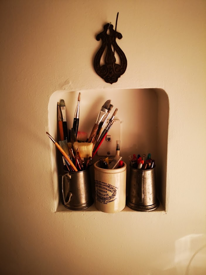 My kitchen, a vintage phone niche filled with brushes, pencils, pens. And a spike for all the unpaid bills, when they get paid.