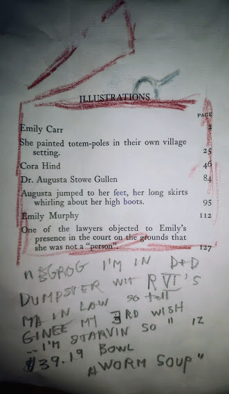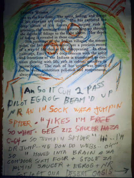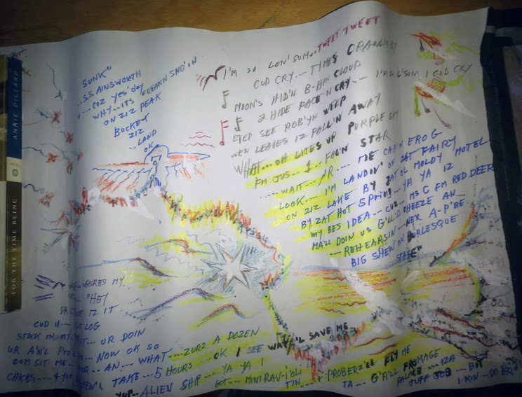 So, if you were wondering, he's fine. And this morning I unrolled his scrolls - well over 100, prodigal output for a couple of weeks, and - by the looks of some of them they're allowing him back into Cowan's to do his photocopying (they bar him every couple of days or so, I understand why, but STILL the man's the greatest living artist in the Kootenays, maybe even all of Canada, so cut him a little slack...).