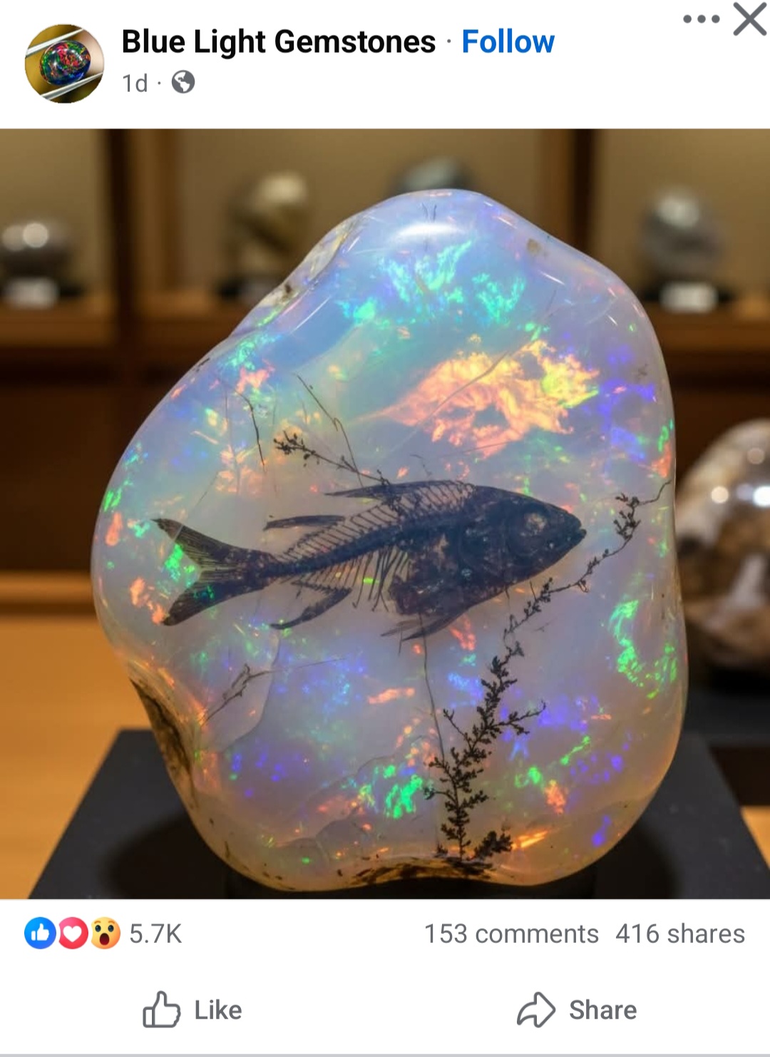 This, my facebook filling up with AI slop, pandering to my taste. Adverts for things that don't exist (search every website every link takes you to!!), posts about made-up-facts, or made up minerals like the few I'll post below: