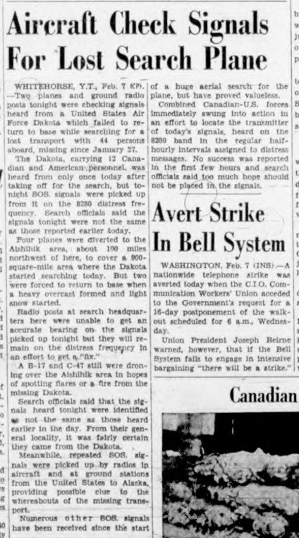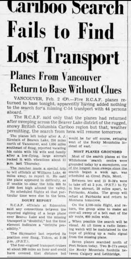 What is especially curious is the fact that intermittent SOS/distress calls were picked up for 2 weeks following the plane's disappearance, implying that it may have not met with a fiery end (as reported by one warden who reported hearing a "boom"), it may have landed relatively intact and the 44 occupants perished awaiting help. Cold weather, clouds and snow hampered search efforts and quite possibly the plane was entirely covered over and so went unspotted. Another is that it landed on a lake - and come spring sunk to the bottom with it's passengers. There are a few tales like this - try: https://www.cbc.ca/news/canada/calgary/baker-lake-bristol-freighter-underwater-discovery-1.4814719.