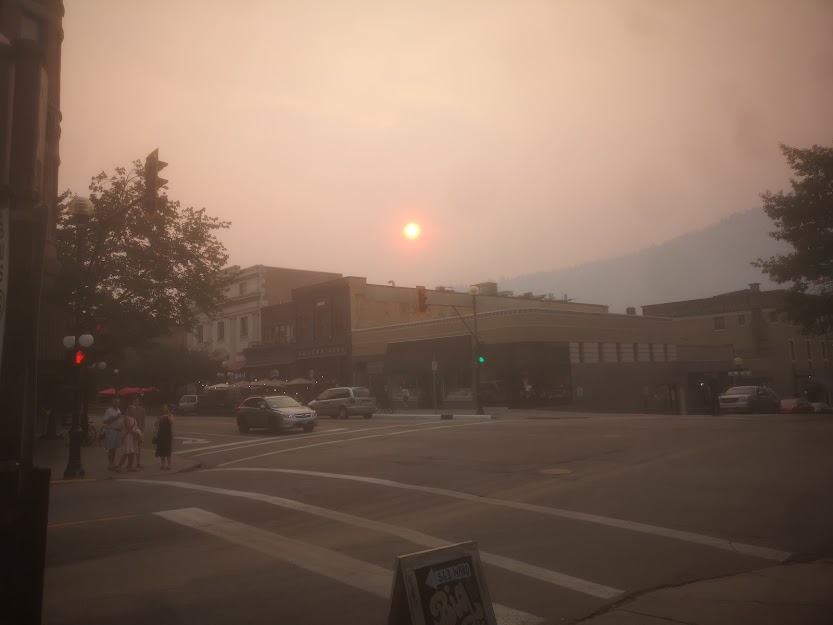 The rough throats, watering eyes, the smoke sticking to you, nosing, nuzzling you, the headlights at night blaze for not a hundred feet before falling off, the sun, setting over the western mountains disappears into smoke long before it goes behind the mountain.