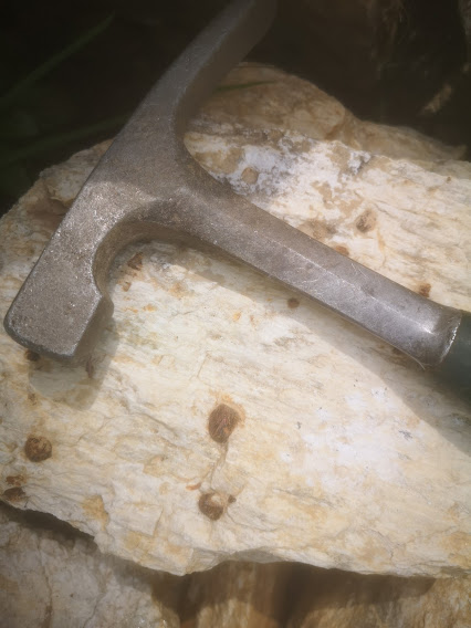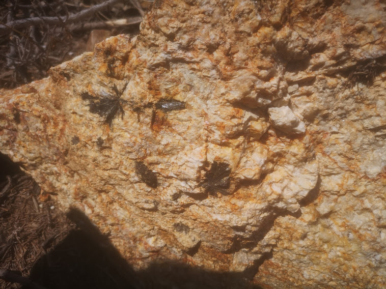 Wednesday the air clears - surprisingly, and so I make a quick trip to the Valley, drive some new roads to new summits, abundant pegmatites, black tourmaline, garnets, feldspar, quartz - dozens of them, the whole drive should be walked over a period of weeks. The jeep sputteringly obliges, takes me to the top: