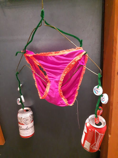 Jealous of her success, I came up with my own "indigent artist" crafts project to sell in the restaurant: The Kootenai Mancatcher. Tradition has it that when a Kootenai girl came of age and found herself single, she'd assemble a mancatcher from a pair of her choicest knickers and hang it upon her schoolbus or trailer to demonstrate her availability ....