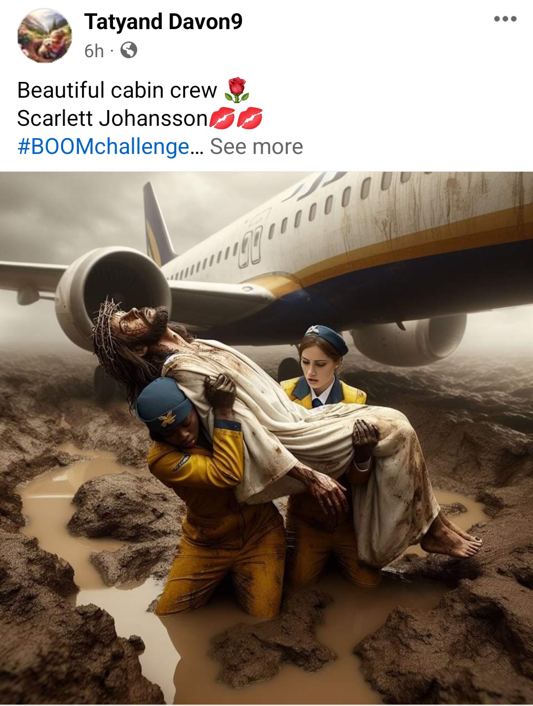 And here we have Pilot Jesus stepping on Dead Jesus in a mud filled plane. He's saving a Stewardess. Nobody sees anything wrong here...