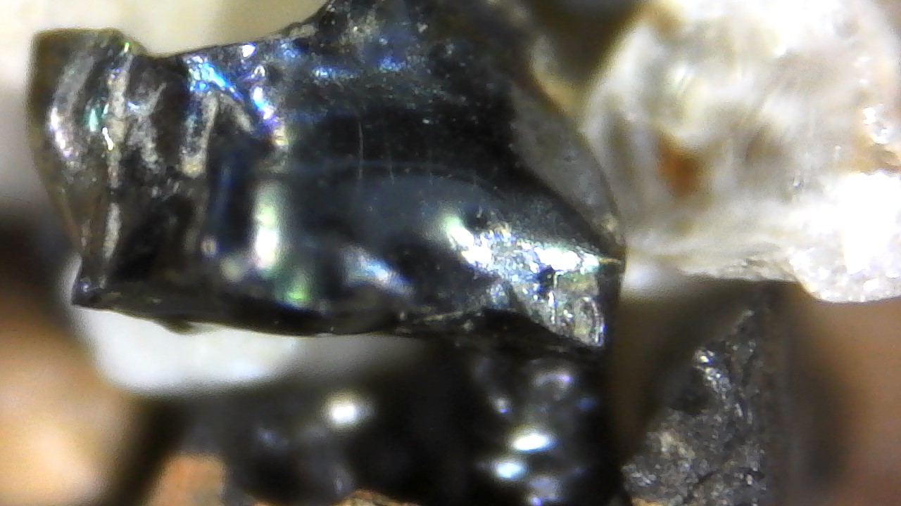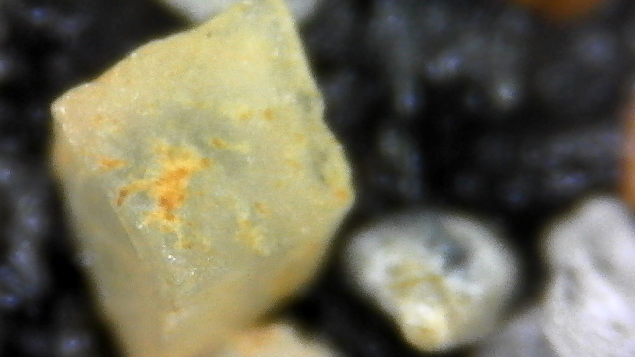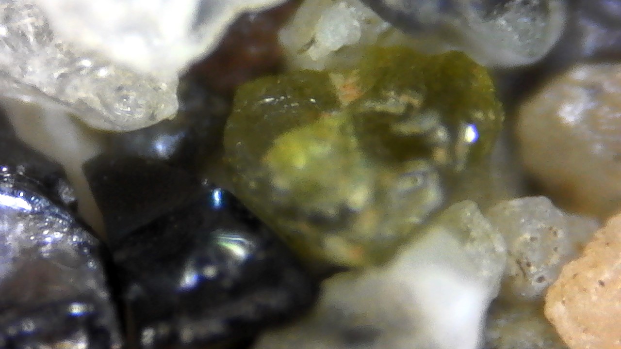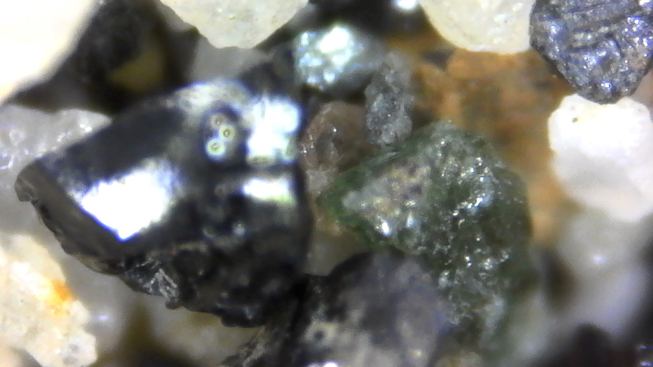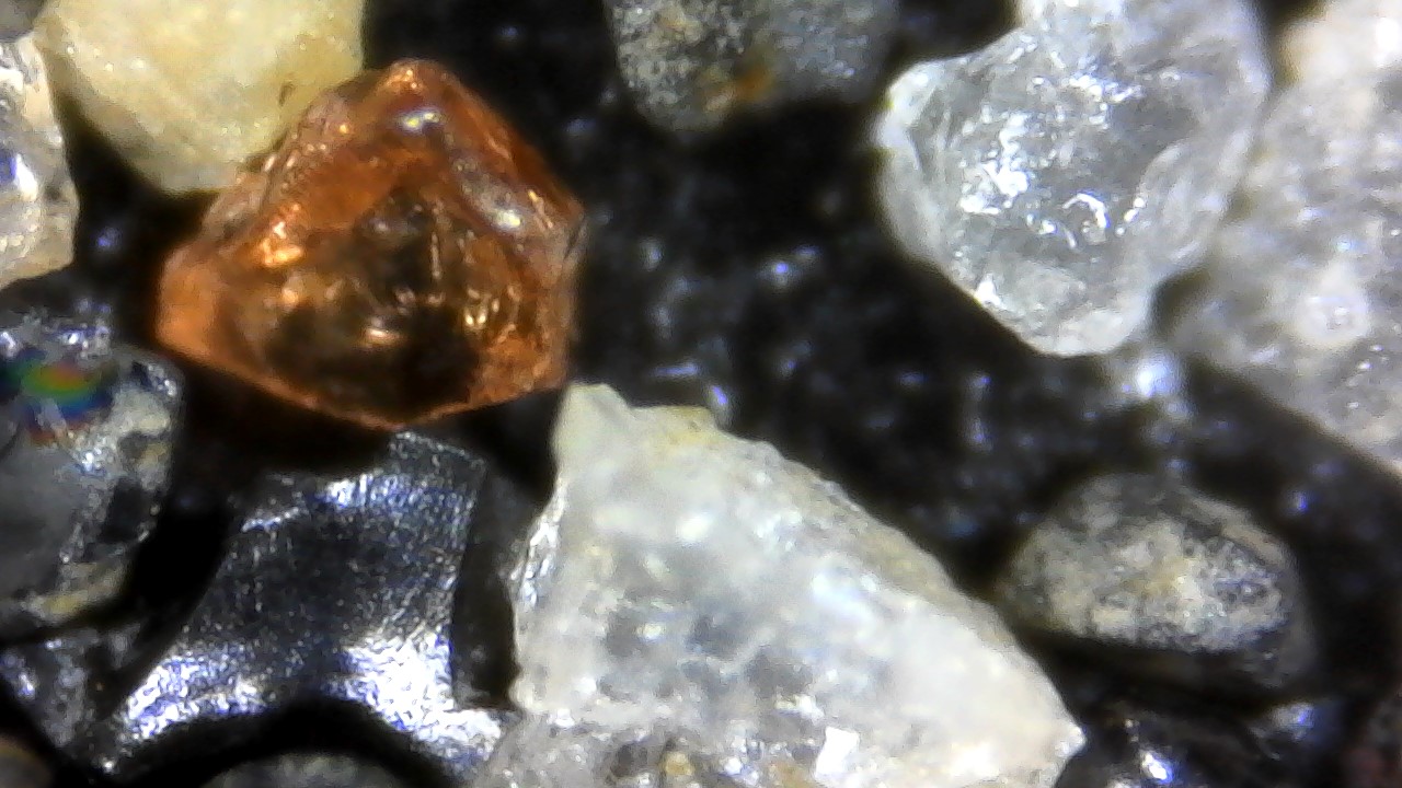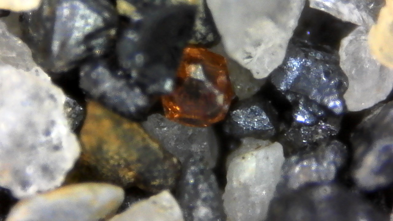 Pictured - under the USB microscope - abundant quartz, garnet, some what appears to be spessartine garnet (orange), hematite spheres (lots of those), various amphiboles, peridot, etc, etc.