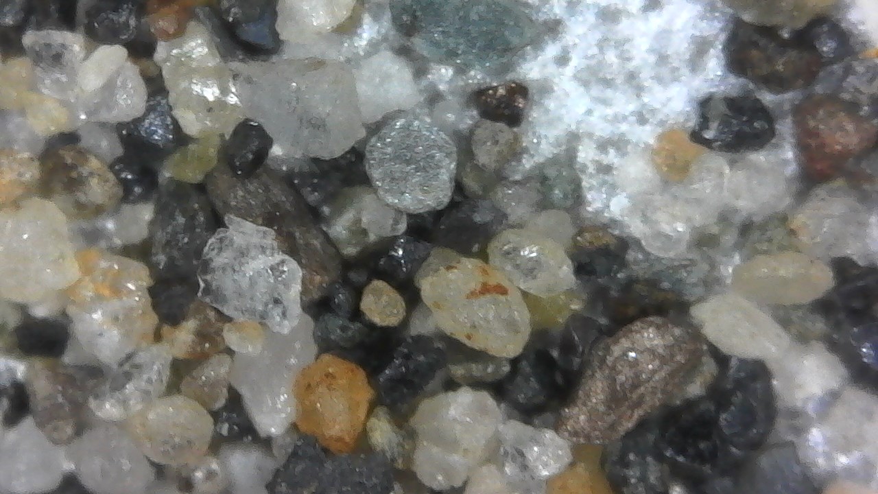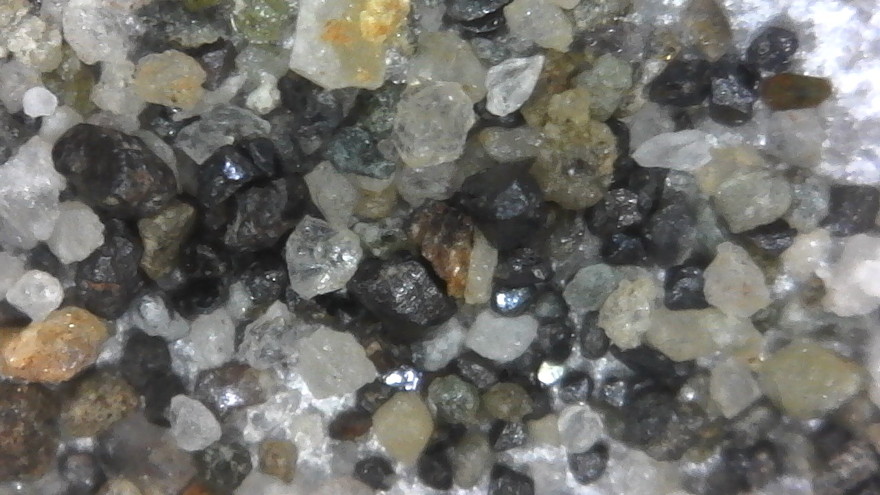 This, using my USB Microscope to examine the concentrates, the black triangular crystals have me puzzled, the clear - quartz, green - peridot, the rest?
