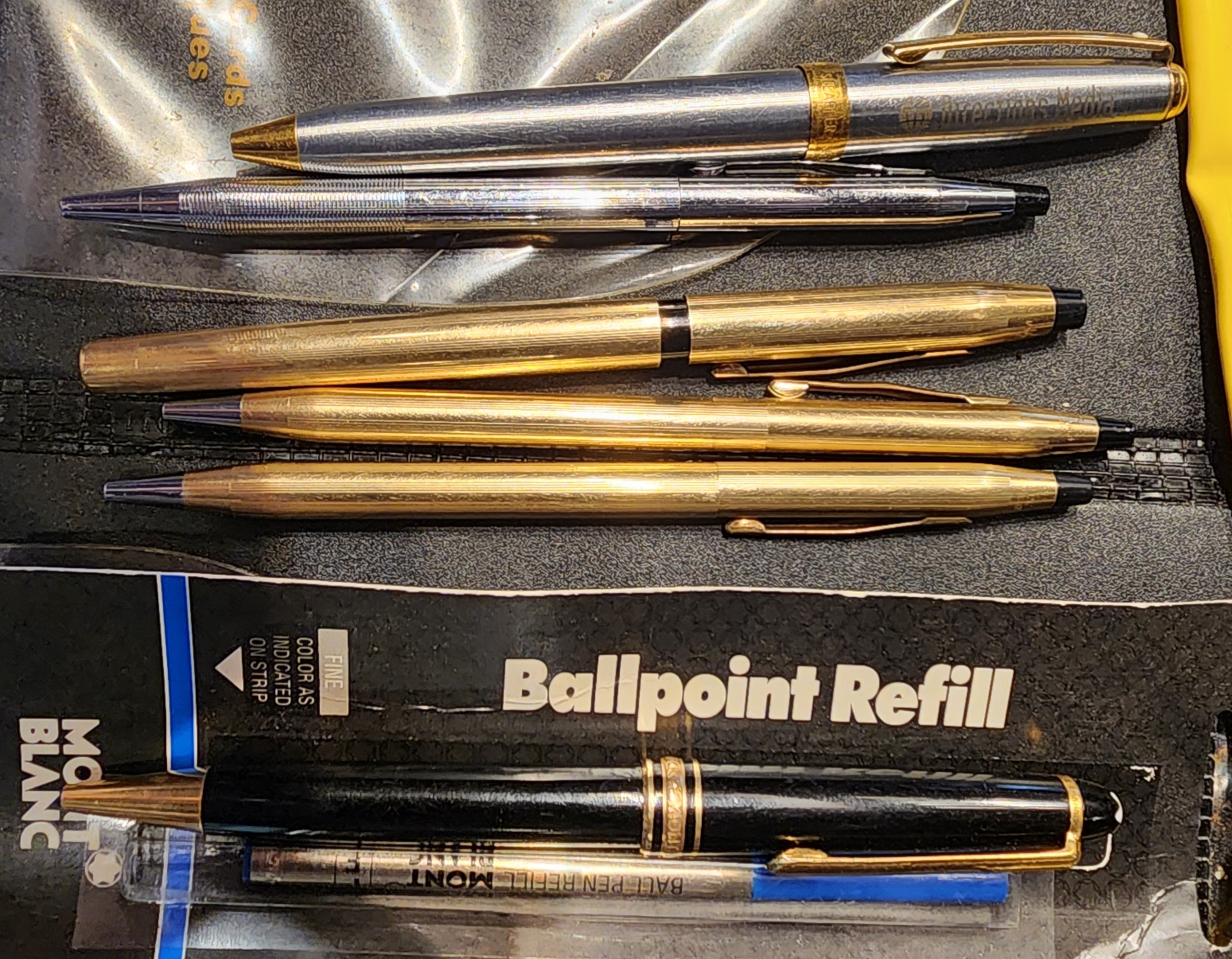 6 Pens, 1 Mont Blanc, 4 Cross, 1 Schaeffer. "How Much?"... "A dollar?". I give him $10, it's all I have, there are limits to how badly I can take advantage of somebody.