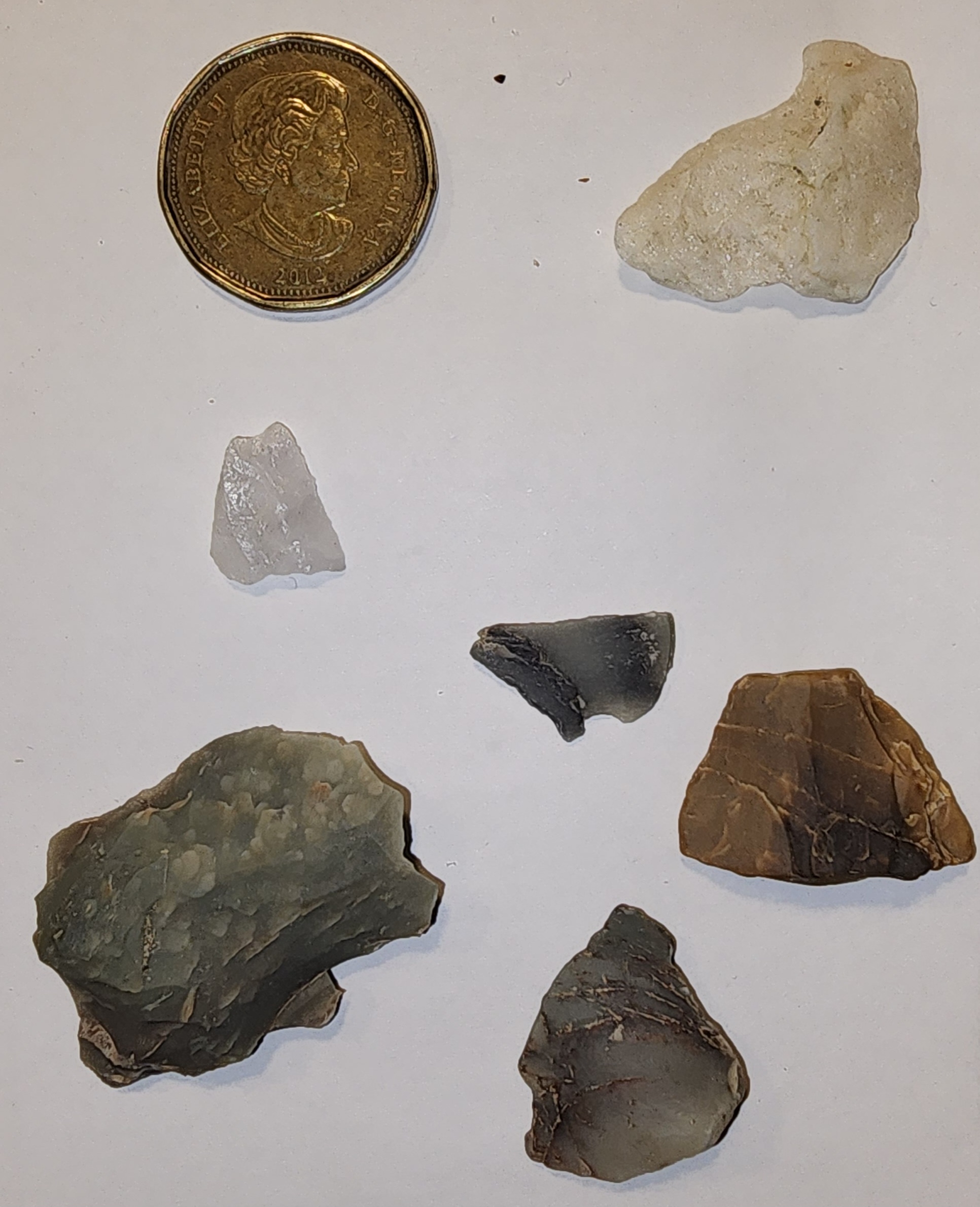 Left, a well knapped scraper, right-centre (brown) a broken arrowhead, top right a peculiarly broken piece of quartzite, which may or may not have been a scraper or tool, and under the loonie a tiny quartz point (close up it shows sign of being worked, although it just may be the grain of the quartz).