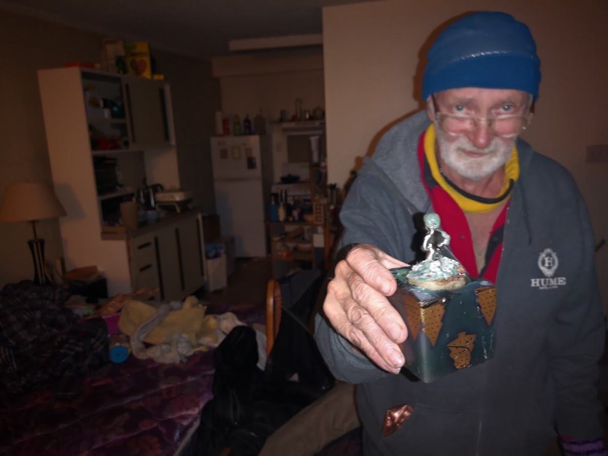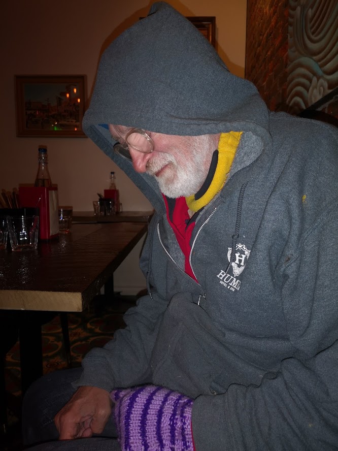 Out for dinner, he's affecting a "Banksy" look. The mitten - well, he had a stroke about 7 or 8 years ago - was left handed, then had to learn to draw with his right hand all over again.