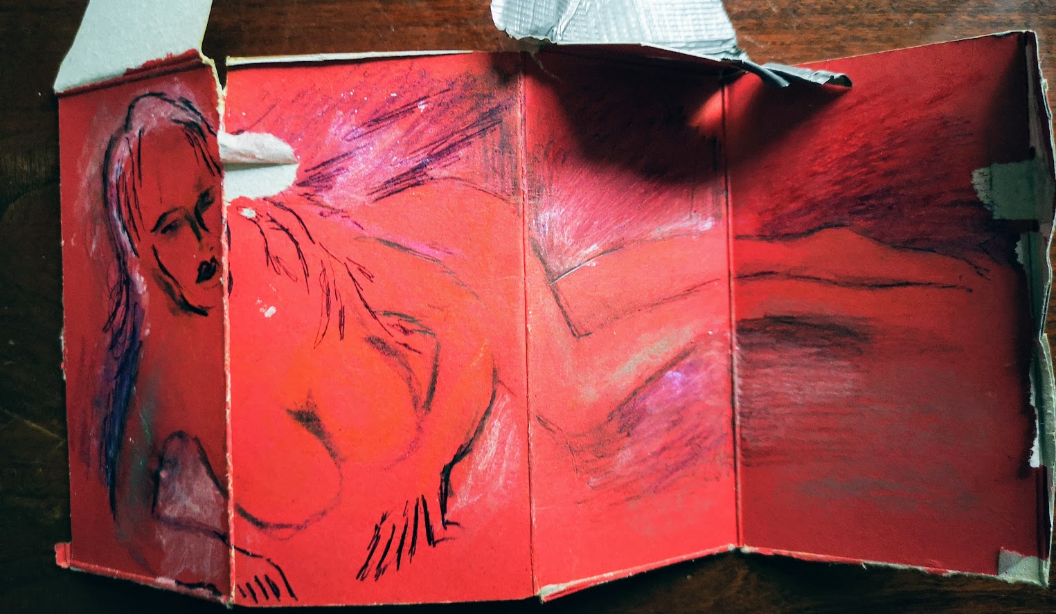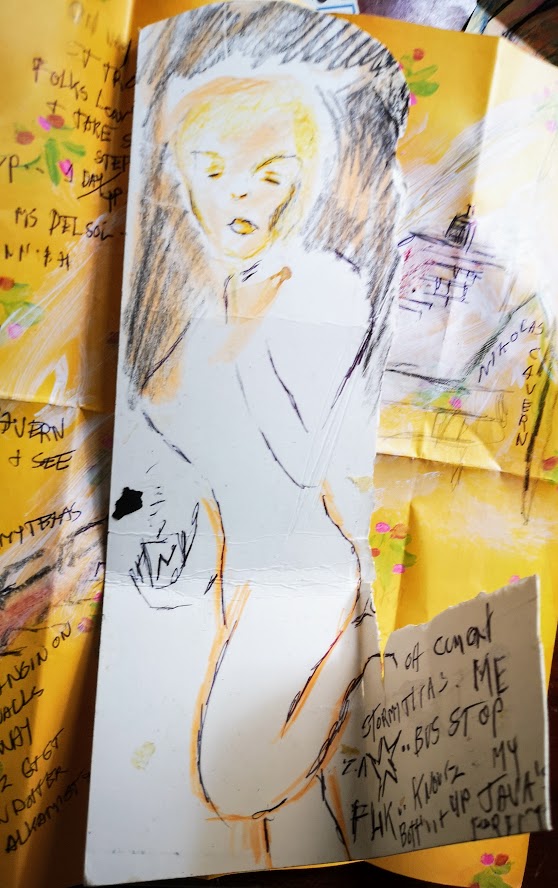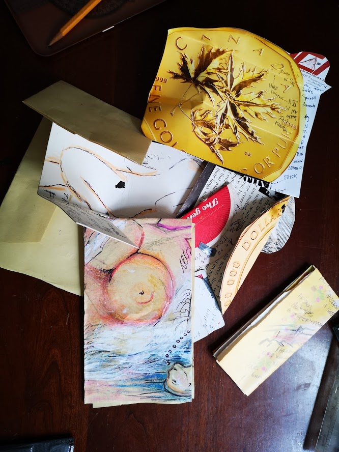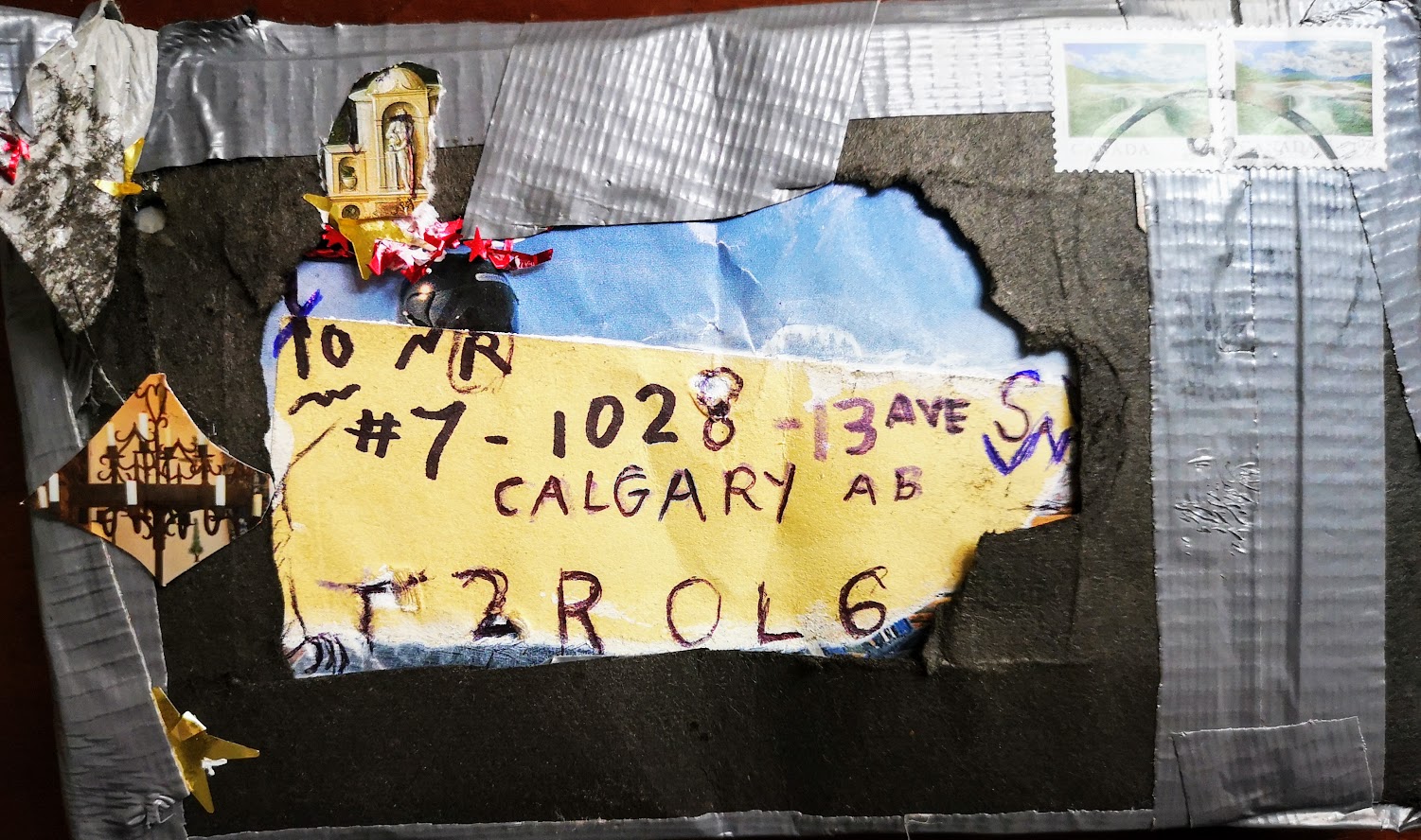 A proper mixed-media assemblage (of postcards and photos that I'd sent him...nothing goes to waste!!)