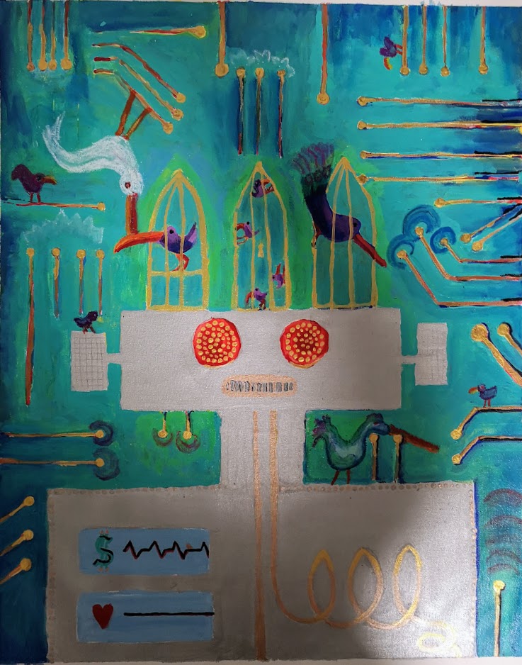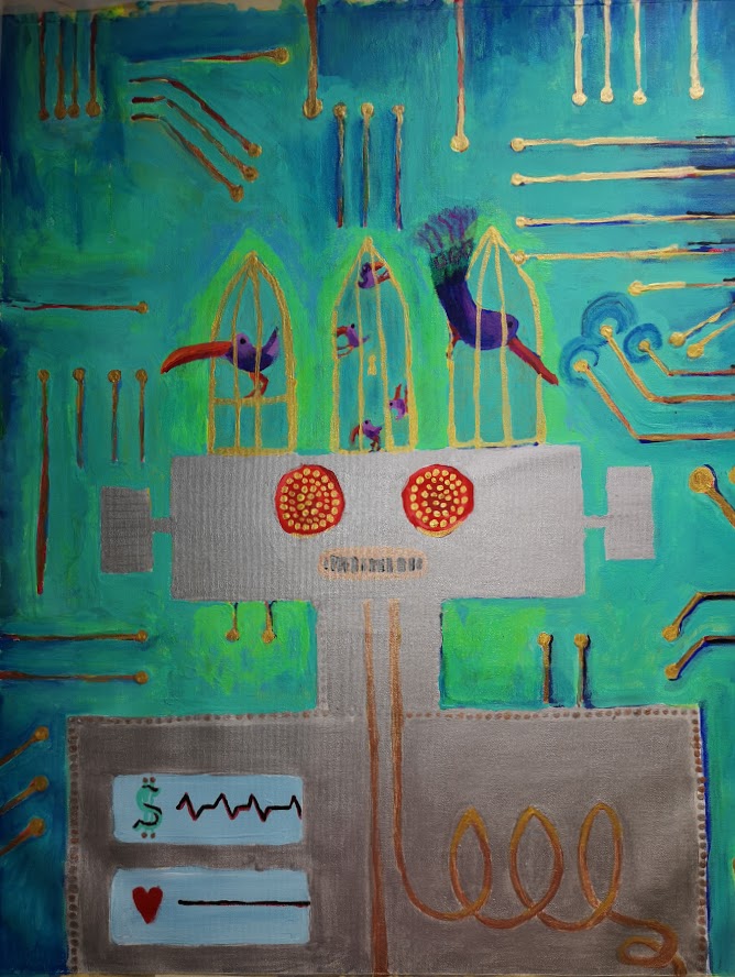 I had done another painting the night before, mixed media on paper. I started with watercolor pencils, then ink, then some acrylic and oil pastels. It worked quite well. And so I took the success to heart and started another - Robot, instead of paper using canvas and starting with watercolor pencil and acrylic: