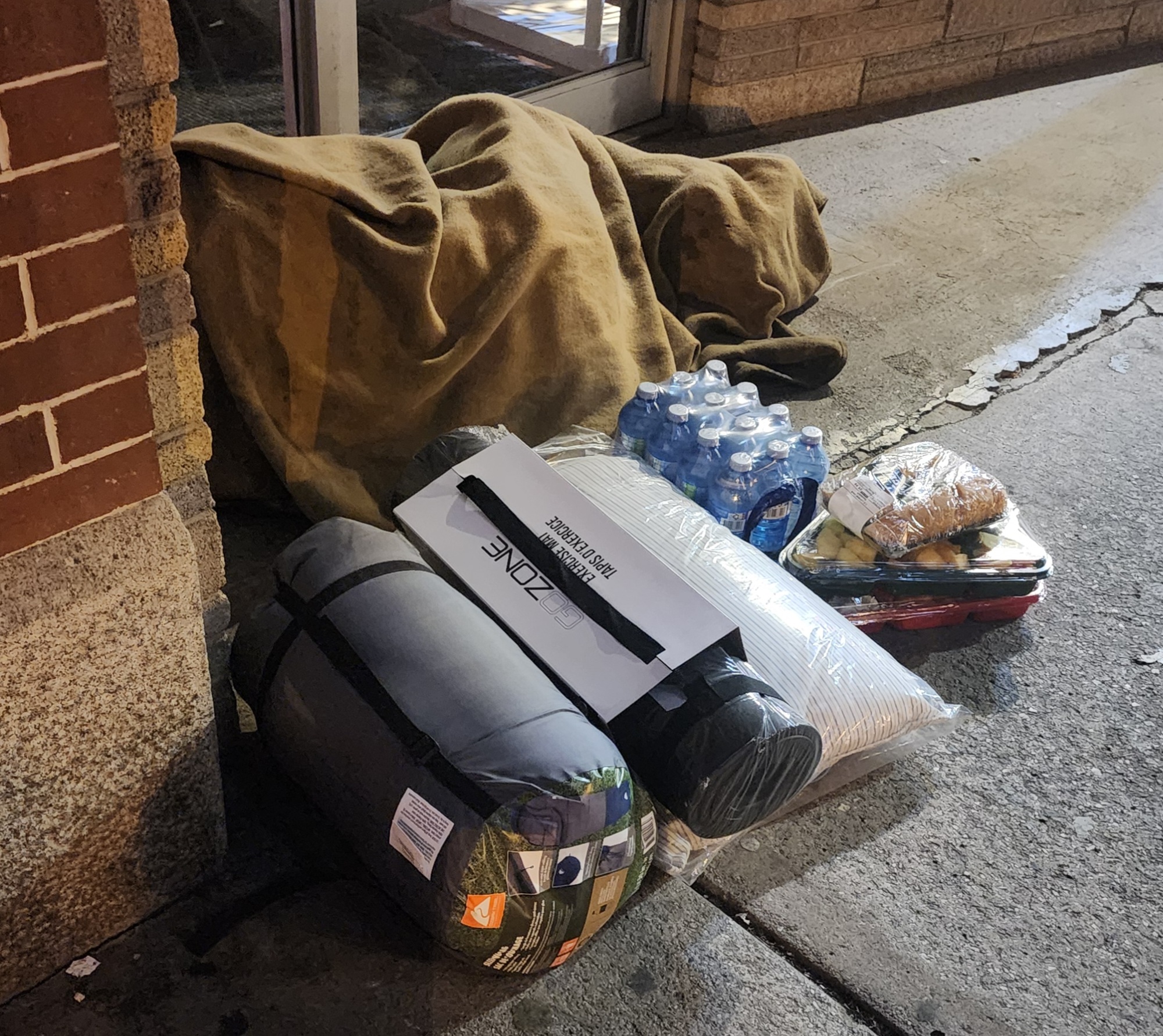 L*****, local homeless resident and loon, being gifted an abundance of outdoor-living supplies for Xmas. Sad to say the next night I'd passed him he had none of it - and while it would be easy to suspect it was stolen, it's just as easy to imagine he woke up, looked at it, and then just moved on.